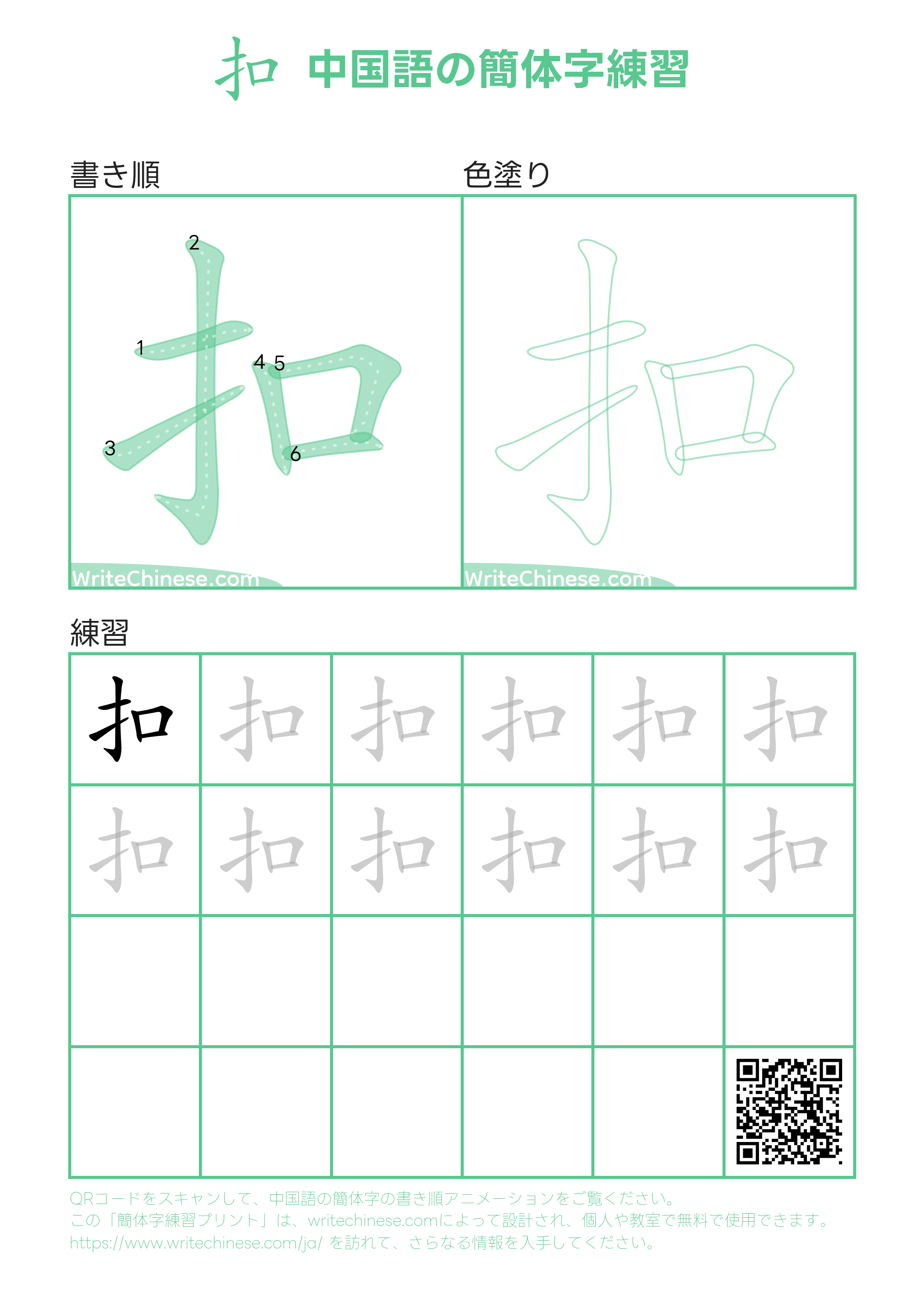 書道の先生によるビデオチュートリアルで、中国語「扣」の正しい書き方を学びましょう。書道の達人によるステップバイステップのガイドに従って、中国語「扣」を書きましょう。以下の印刷可能な手書き用のワークシートをダウンロードして、ペンと紙で一緒に書く練習をしましょう。