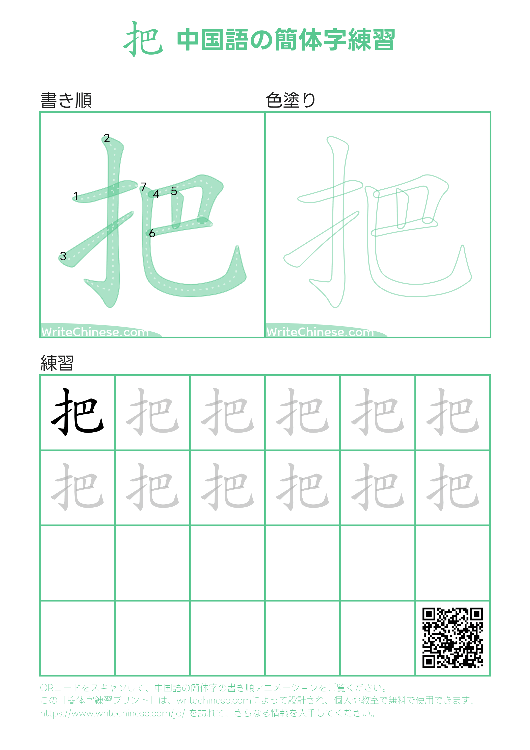 中国語の簡体字「把」の書き順練習用の印刷可能なワークシート