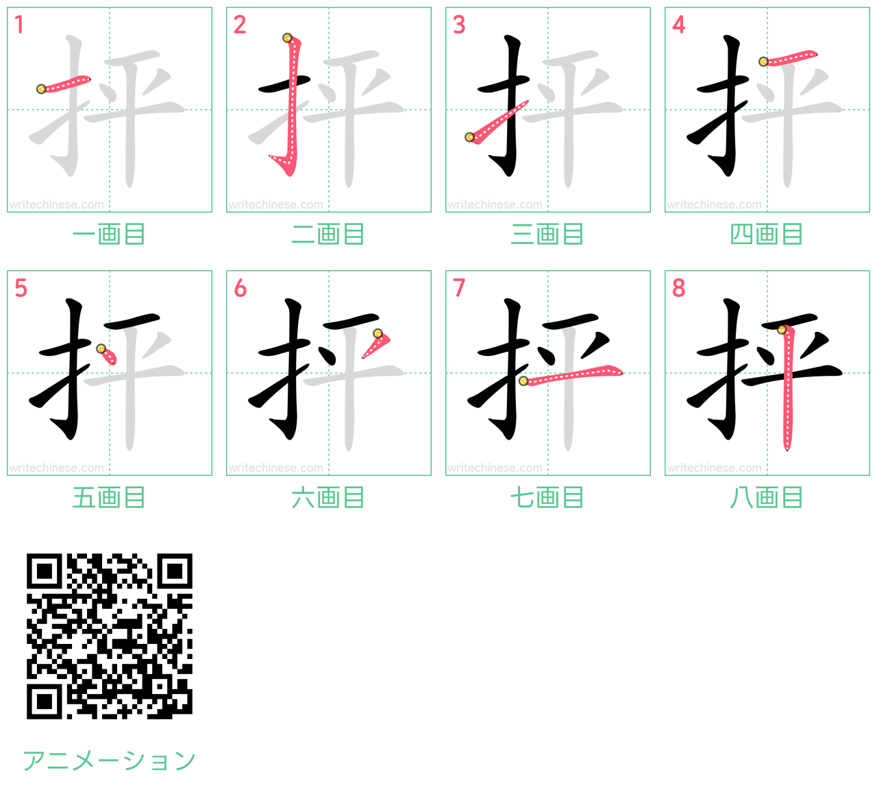 視覚的なステップバイステップの指示を使って、中国語の漢字「抨」の書き順を一画ずつマスターしましょう。