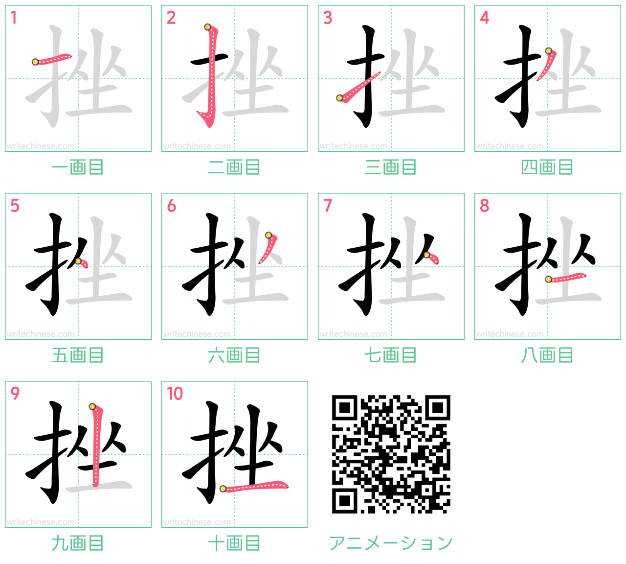 中国語の簡体字「挫」の筆順アニメーションを見て、「挫」という漢字の書き方を学びましょう。