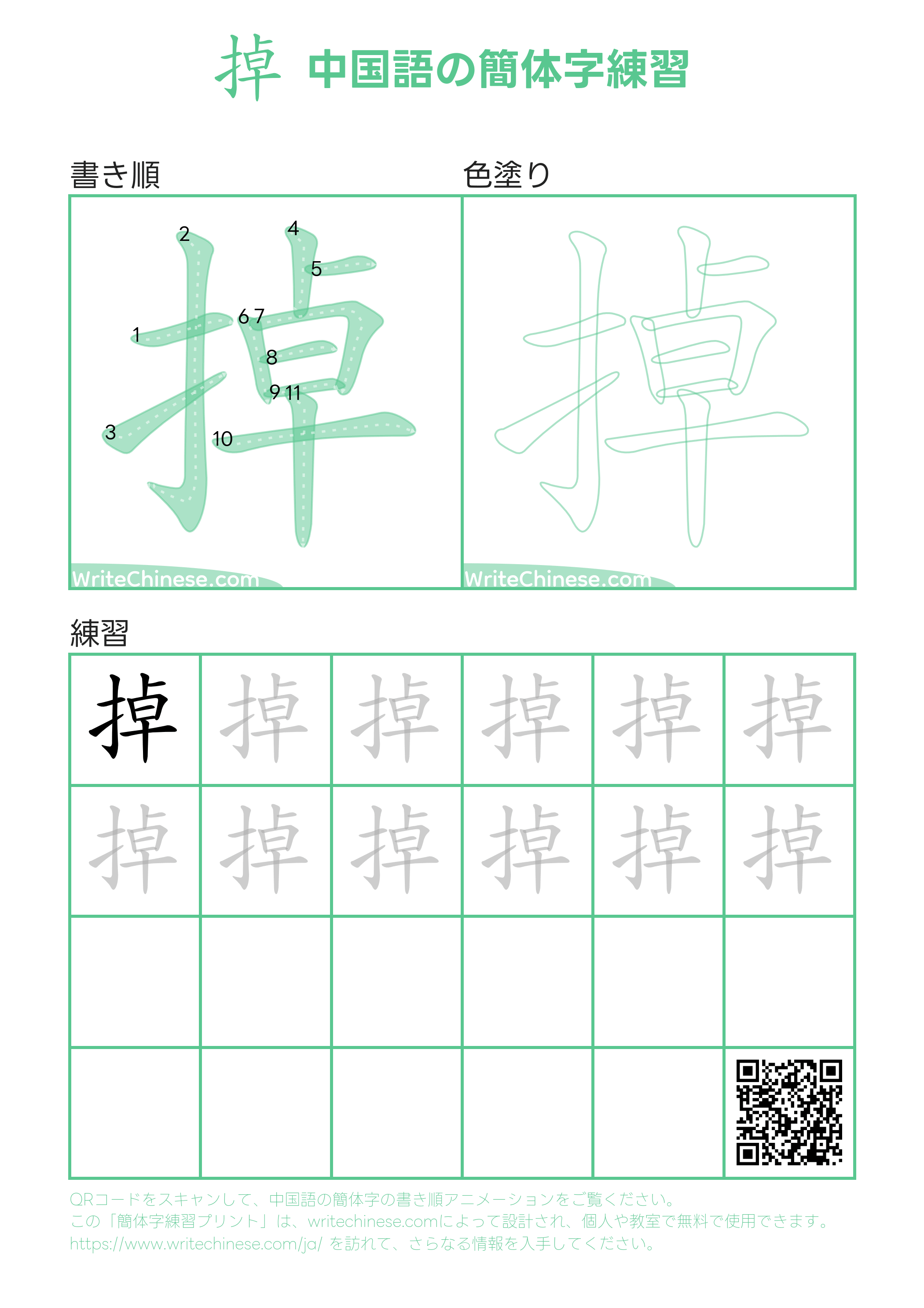 書道の先生によるビデオチュートリアルで、中国語「掉」の正しい書き方を学びましょう。書道の達人によるステップバイステップのガイドに従って、中国語「掉」を書きましょう。以下の印刷可能な手書き用のワークシートをダウンロードして、ペンと紙で一緒に書く練習をしましょう。