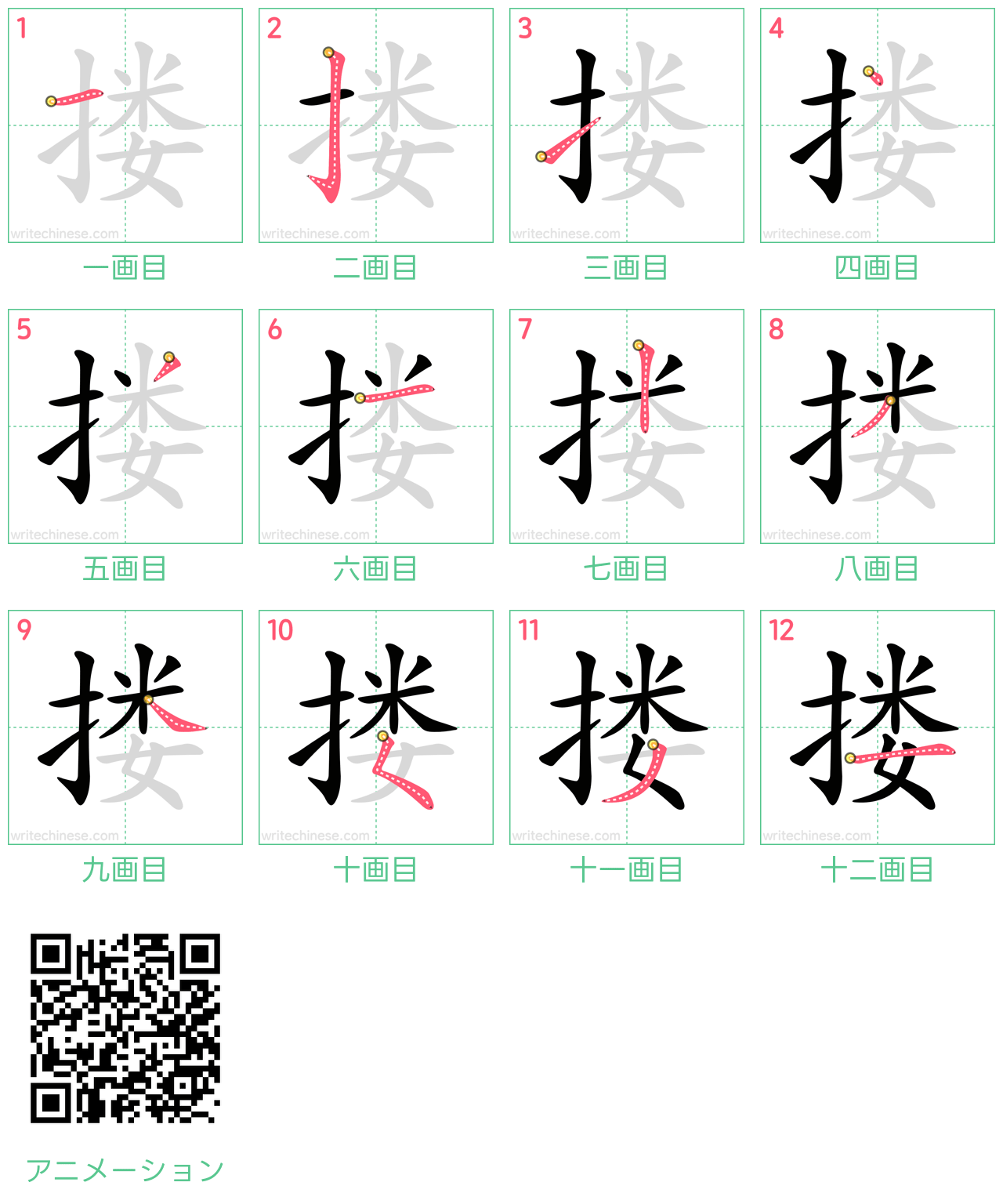 中国語の簡体字「搂」の書き順練習用の印刷可能なワークシート 漢字練習帳