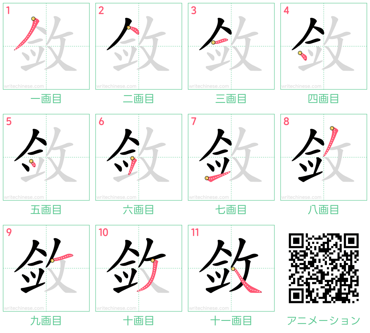 視覚的なステップバイステップの指示を使って、中国語の漢字「敛」の書き順を一画ずつマスターしましょう。