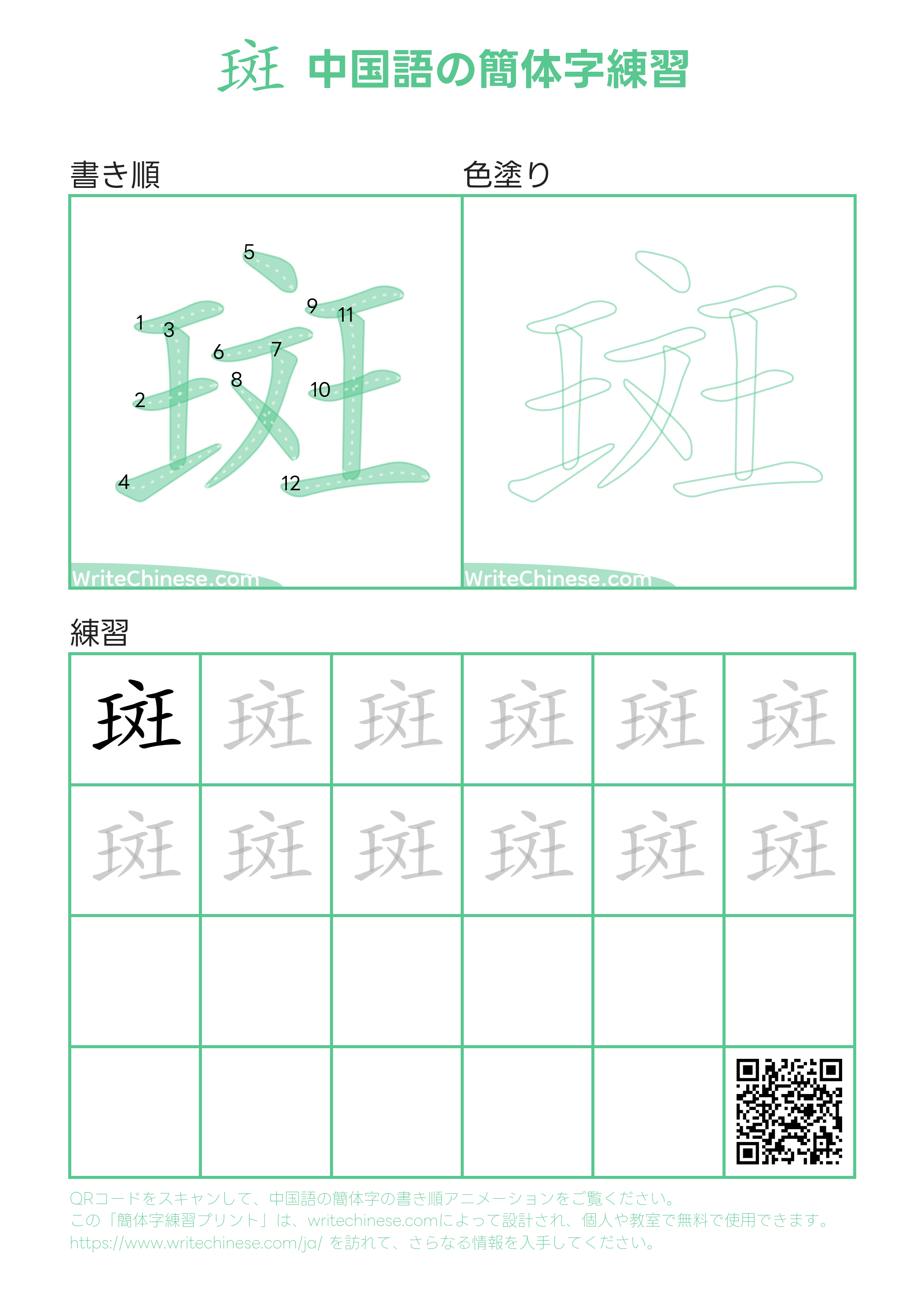 視覚的なステップバイステップの指示を使って、中国語の漢字「斑」の書き順を一画ずつマスターしましょう。