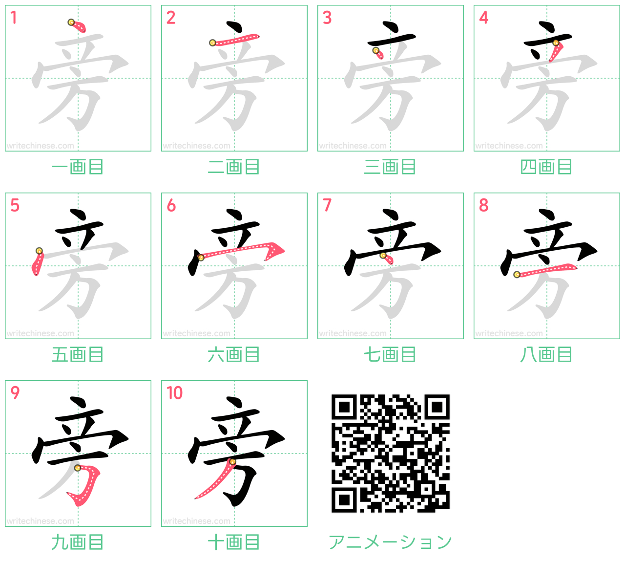 視覚的なステップバイステップの指示を使って、中国語の漢字「旁」の書き順を一画ずつマスターしましょう。