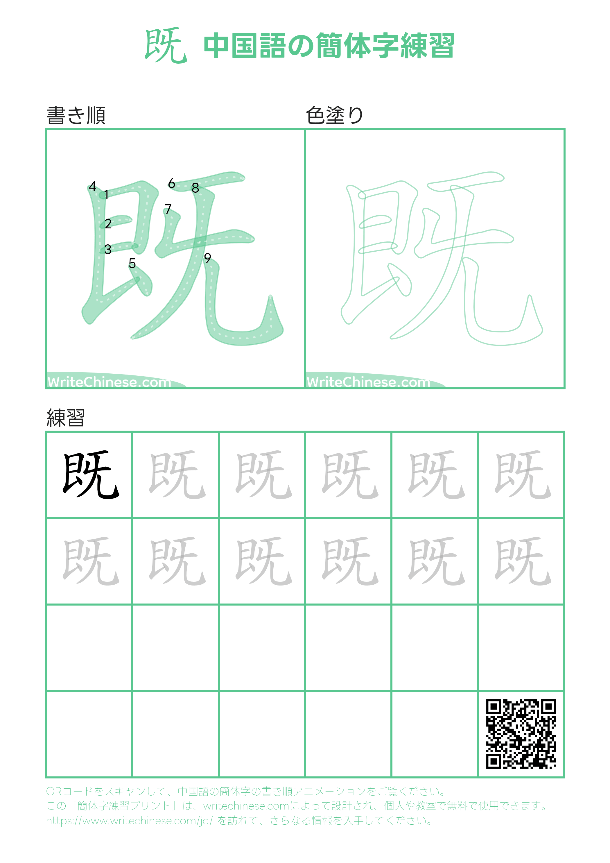 中国語の簡体字「既」の書き順練習用の印刷可能なワークシート