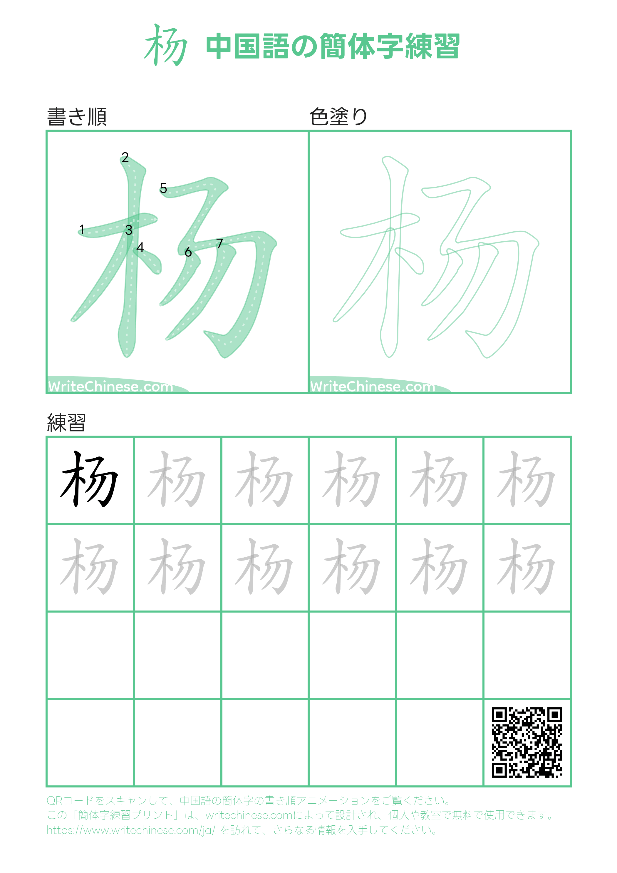 書道の先生によるビデオチュートリアルで、中国語「杨」の正しい書き方を学びましょう。書道の達人によるステップバイステップのガイドに従って、中国語「杨」を書きましょう。以下の印刷可能な手書き用のワークシートをダウンロードして、ペンと紙で一緒に書く練習をしましょう。