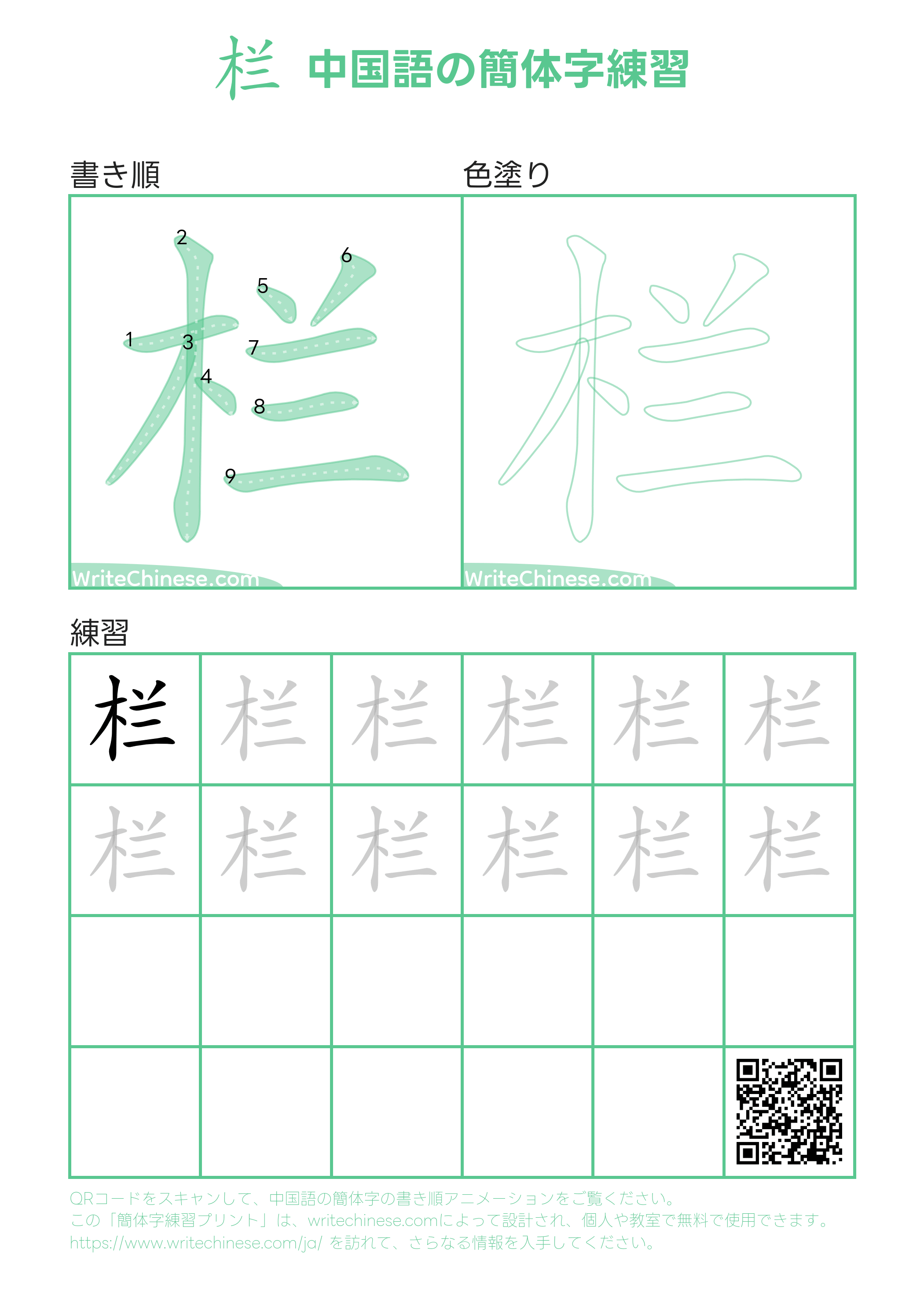 書道の先生によるビデオチュートリアルで、中国語「栏」の正しい書き方を学びましょう。書道の達人によるステップバイステップのガイドに従って、中国語「栏」を書きましょう。以下の印刷可能な手書き用のワークシートをダウンロードして、ペンと紙で一緒に書く練習をしましょう。