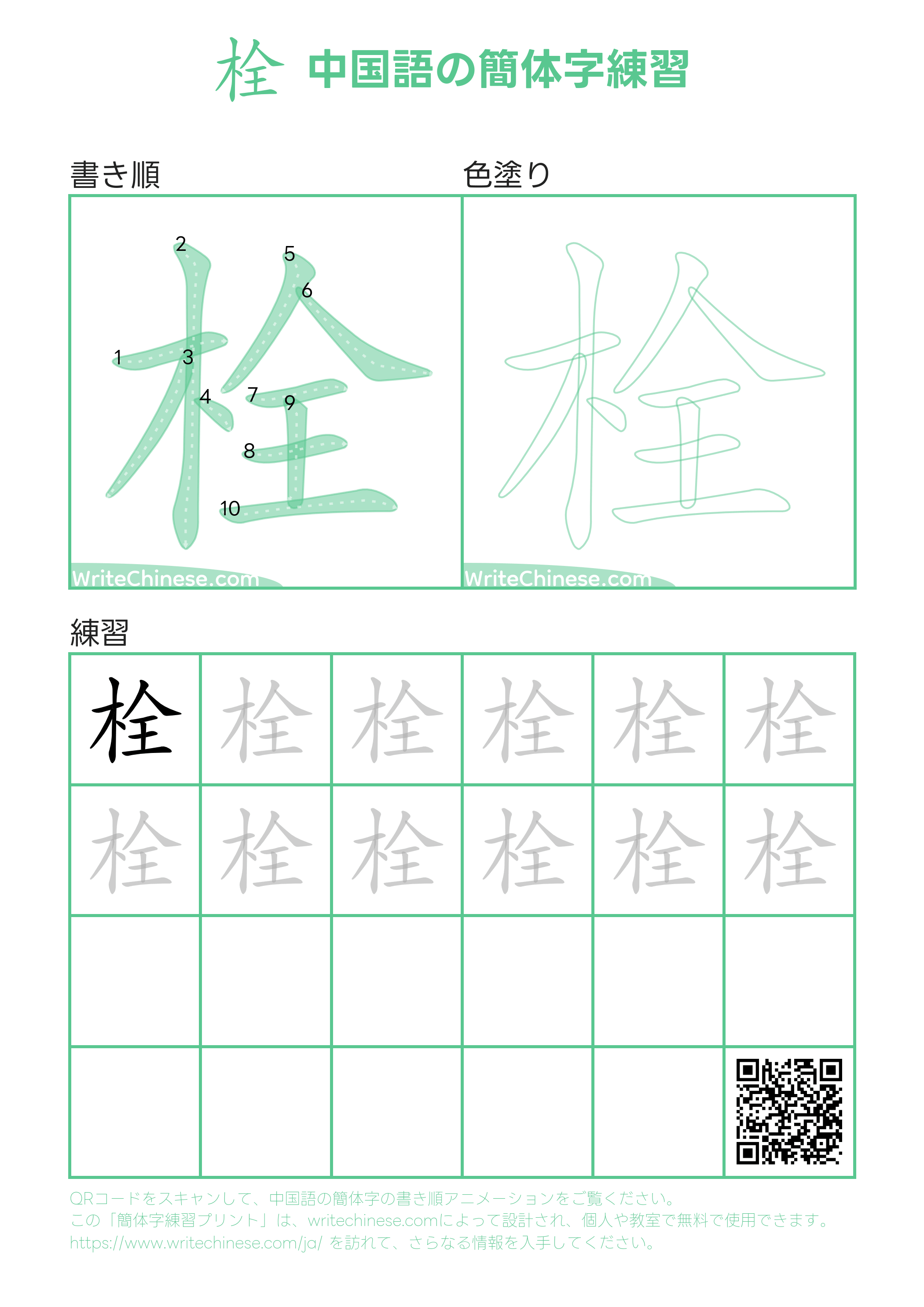 書道の先生によるビデオチュートリアルで、中国語「栓」の正しい書き方を学びましょう。書道の達人によるステップバイステップのガイドに従って、中国語「栓」を書きましょう。以下の印刷可能な手書き用のワークシートをダウンロードして、ペンと紙で一緒に書く練習をしましょう。