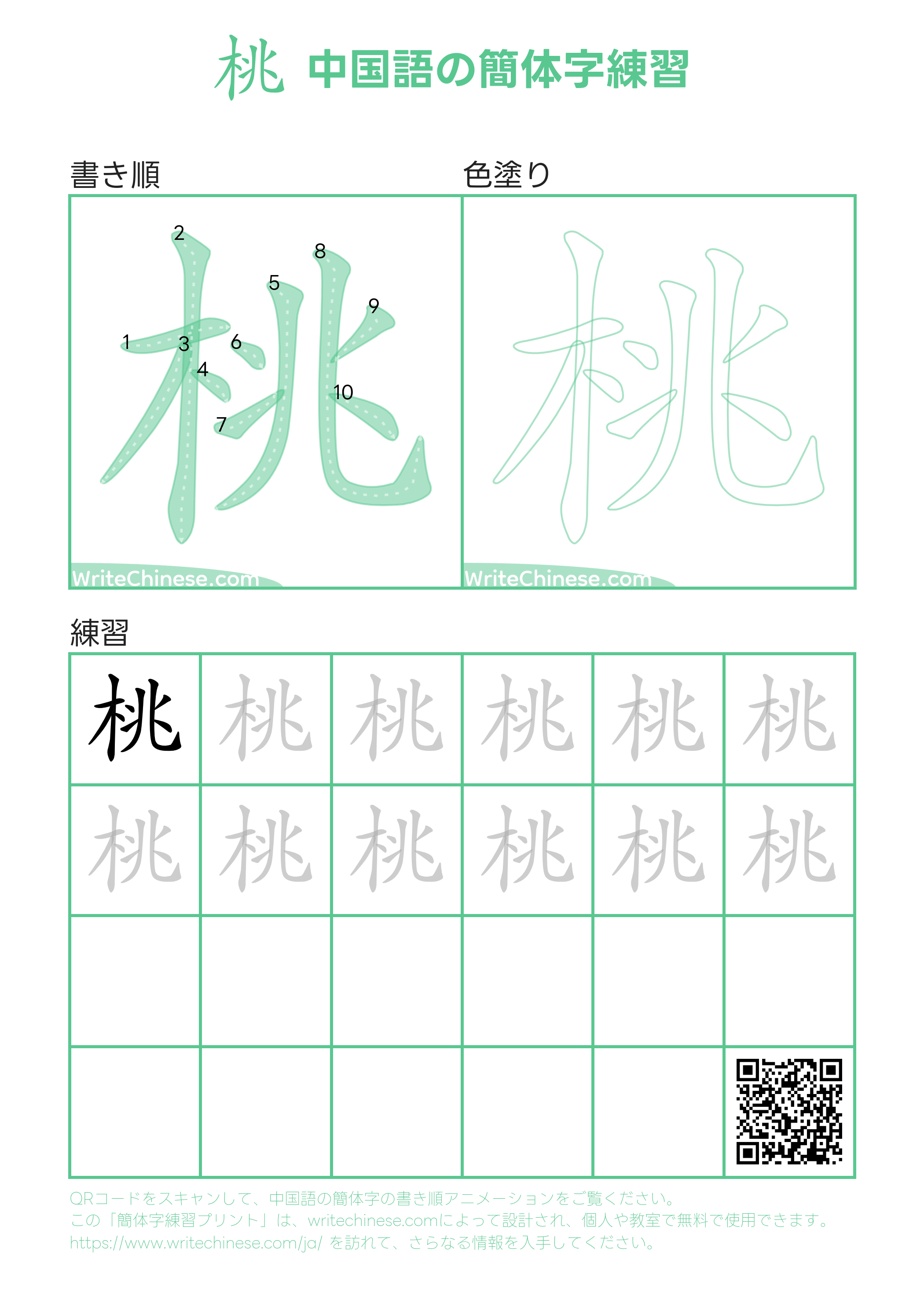 書道の先生によるビデオチュートリアルで、中国語「桃」の正しい書き方を学びましょう。書道の達人によるステップバイステップのガイドに従って、中国語「桃」を書きましょう。以下の印刷可能な手書き用のワークシートをダウンロードして、ペンと紙で一緒に書く練習をしましょう。