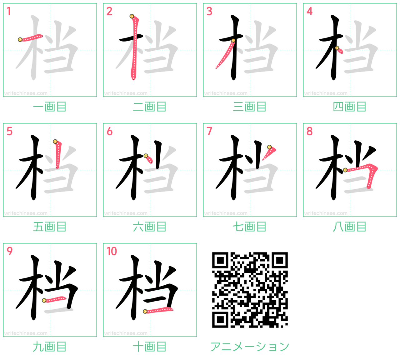 中国語の簡体字「档」の書き順練習用の印刷可能なワークシート 漢字練習帳