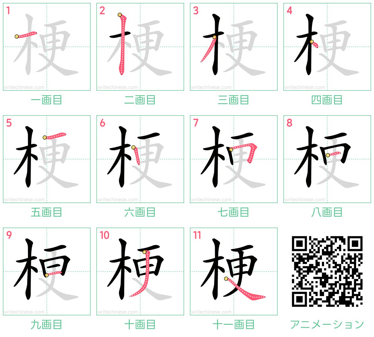 視覚的なステップバイステップの指示を使って、中国語の漢字「梗」の書き順を一画ずつマスターしましょう。