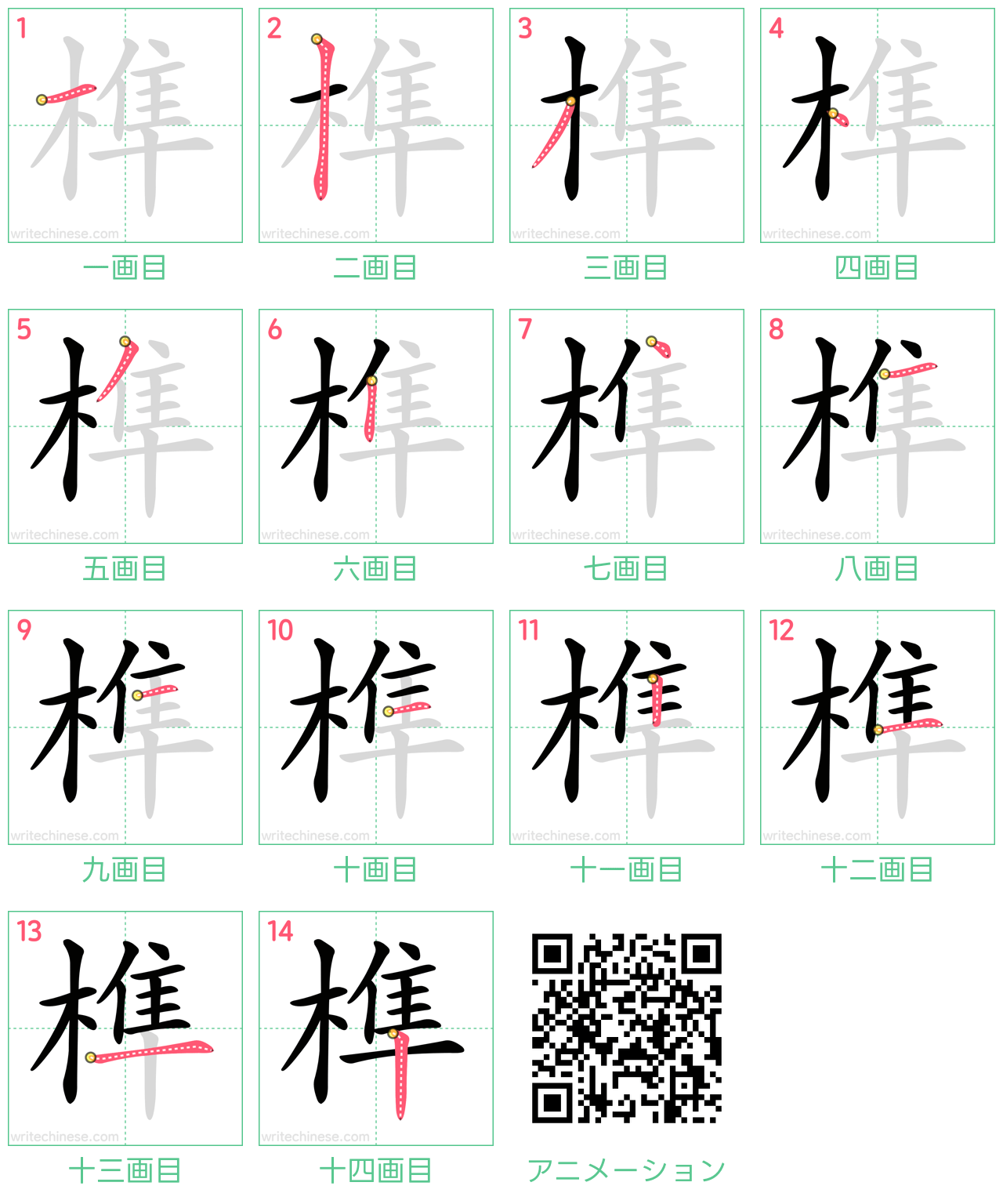 視覚的なステップバイステップの指示を使って、中国語の漢字「榫」の書き順を一画ずつマスターしましょう。
