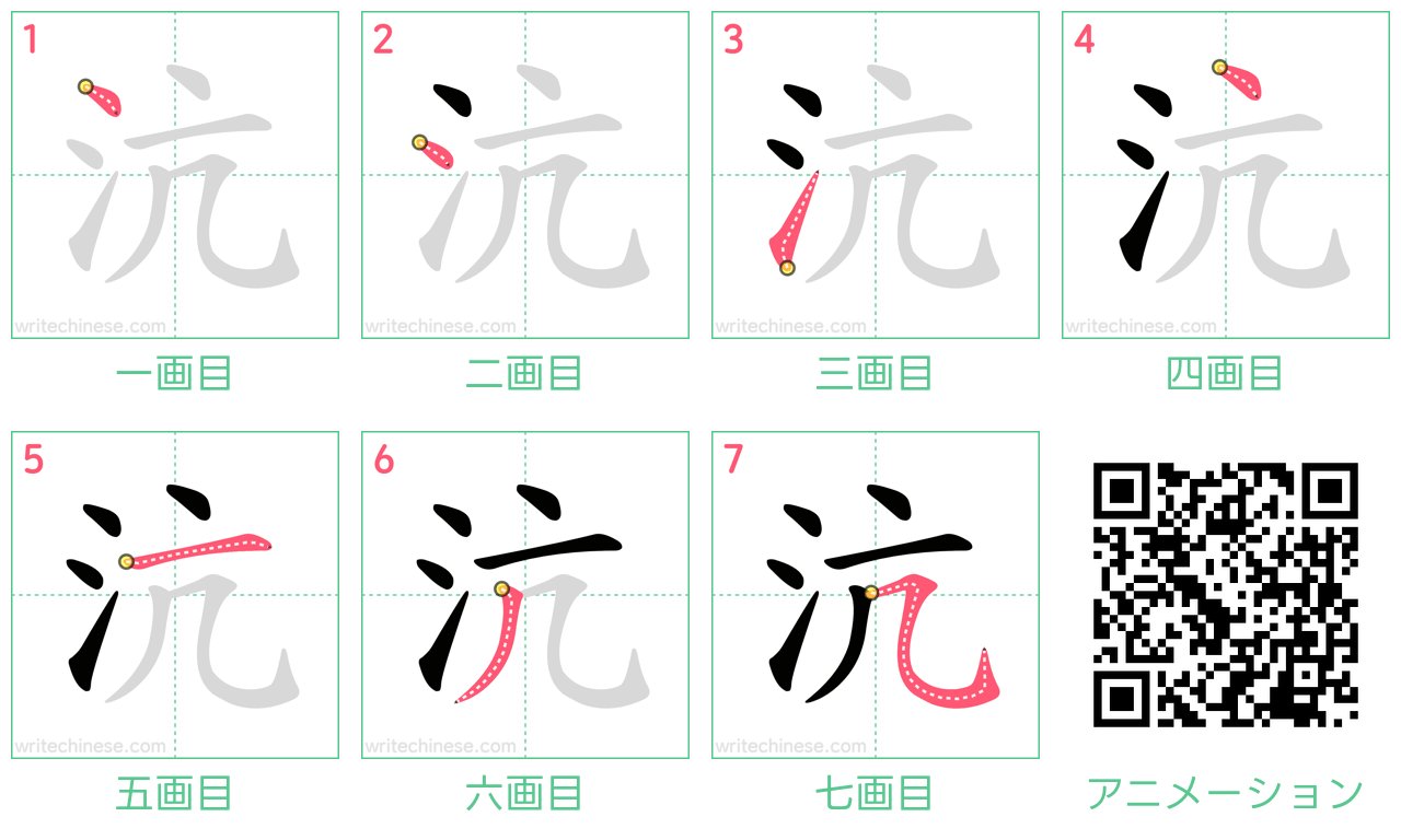 中国語の簡体字「沆」の書き順練習用の印刷可能なワークシート 漢字練習帳