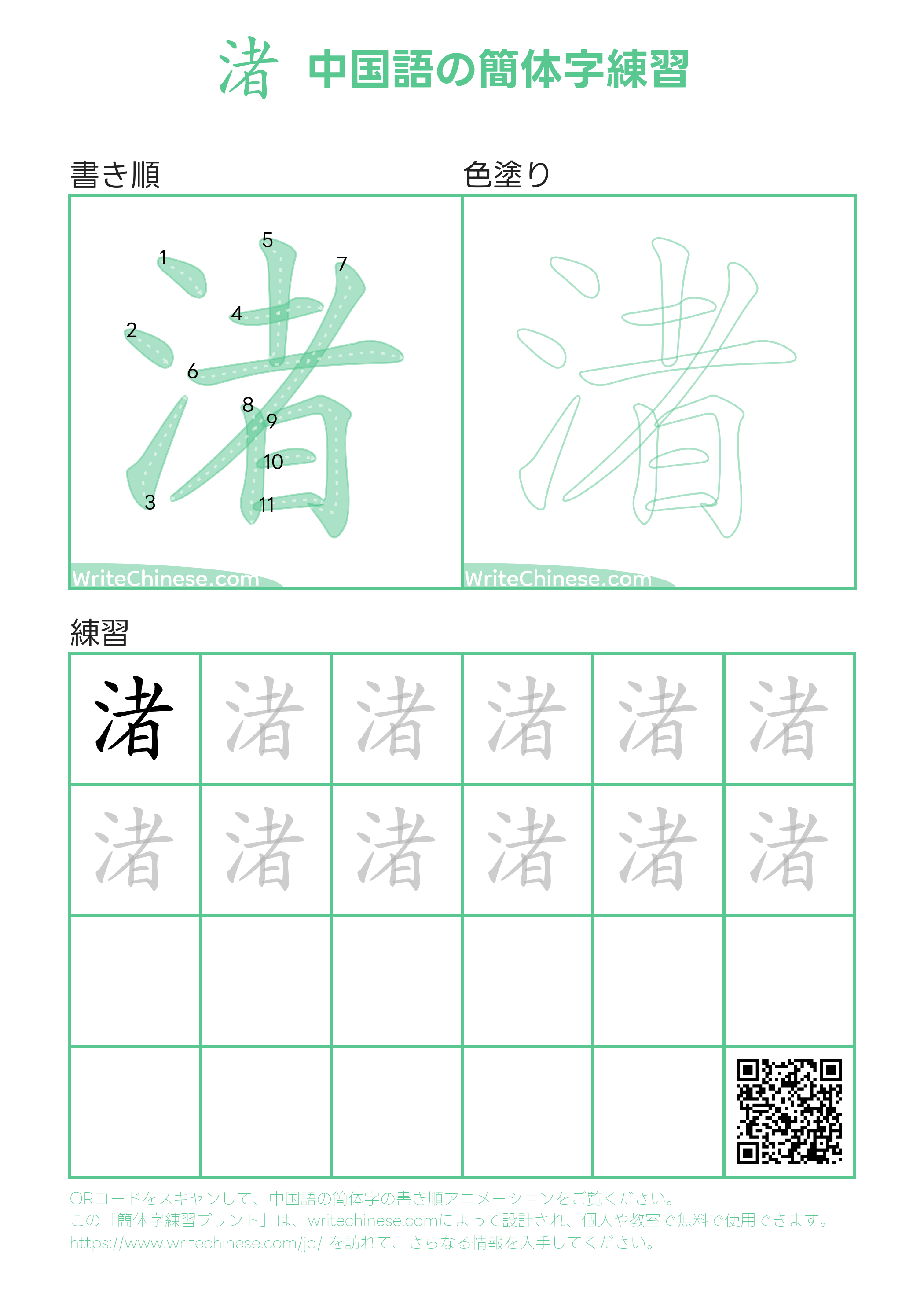 中国語の簡体字「渚」の筆順アニメーションを見て、「渚」という漢字の書き方を学びましょう。