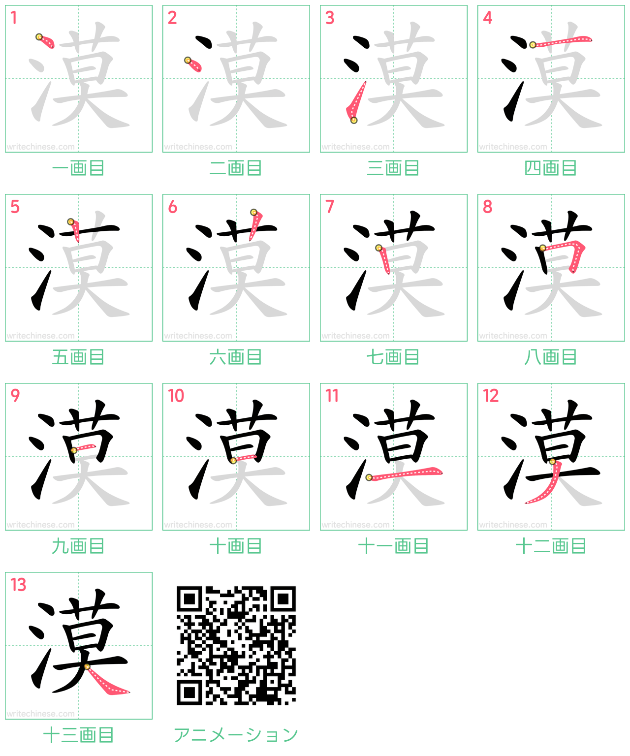 視覚的なステップバイステップの指示を使って、中国語の漢字「漠」の書き順を一画ずつマスターしましょう。