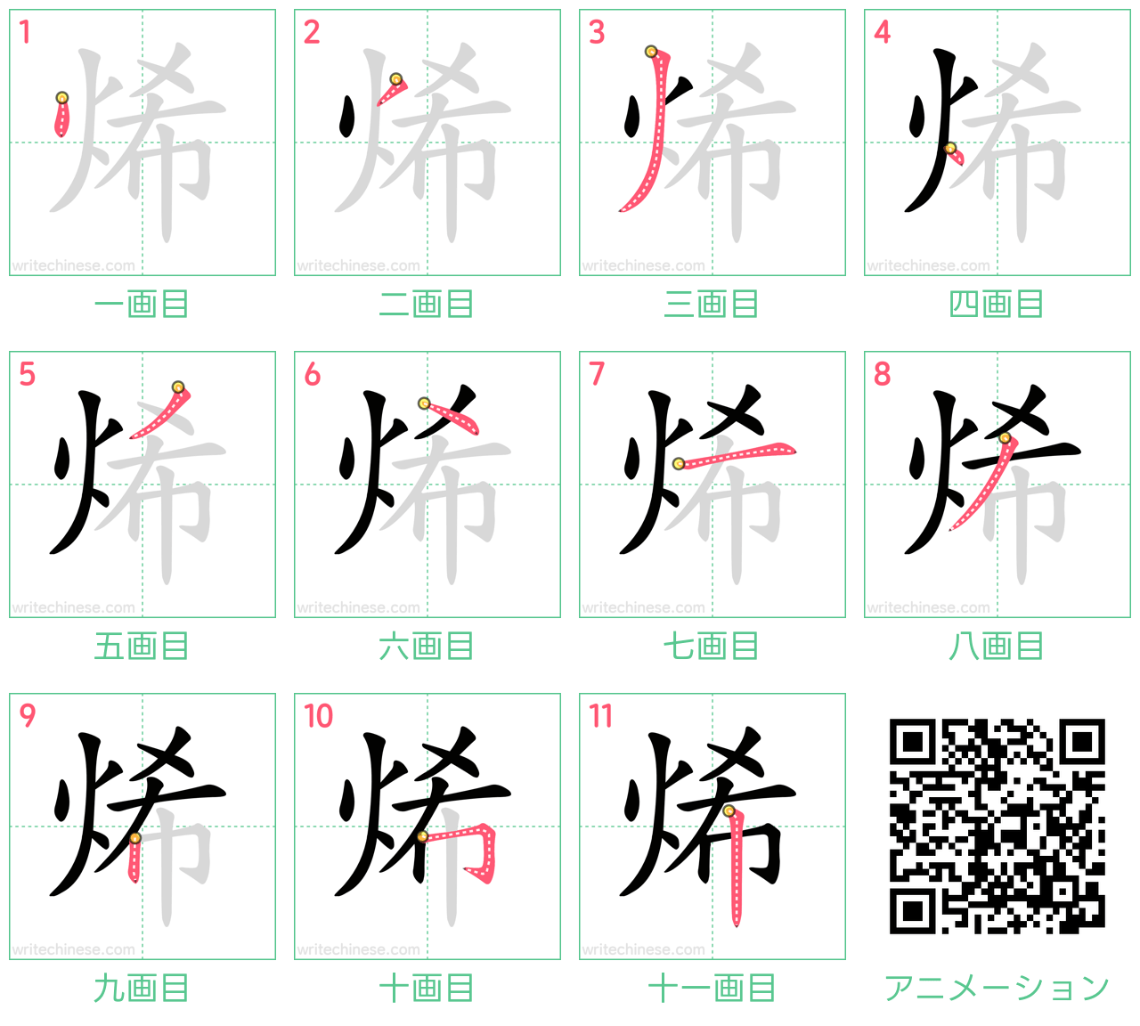 視覚的なステップバイステップの指示を使って、中国語の漢字「烯」の書き順を一画ずつマスターしましょう。