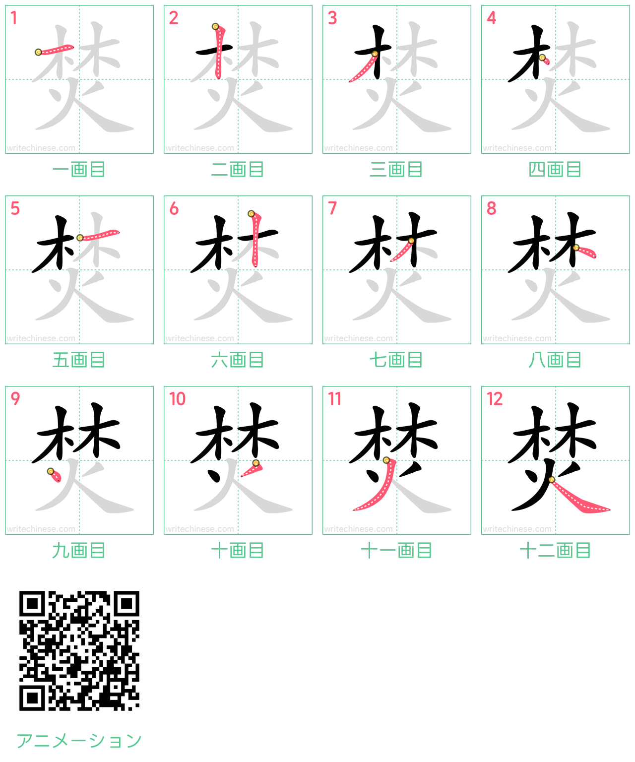 中国語の簡体字「焚」の筆順アニメーションを見て、「焚」という漢字の書き方を学びましょう。