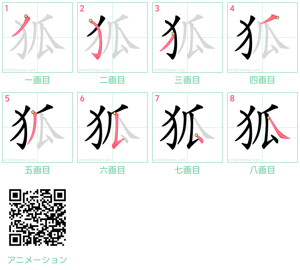 視覚的なステップバイステップの指示を使って、中国語の漢字「狐」の書き順を一画ずつマスターしましょう。