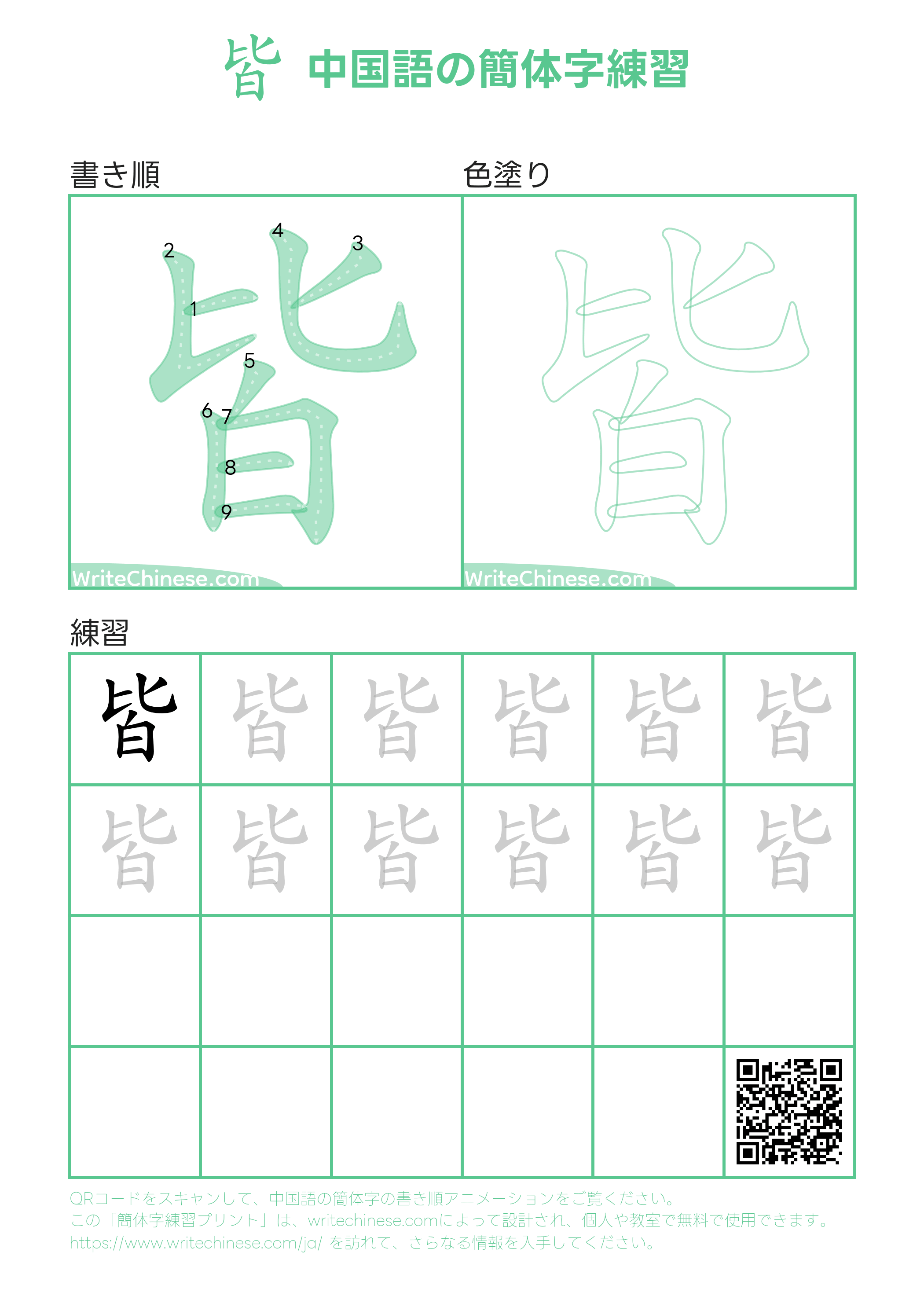 中国語の簡体字「皆」の印刷可能な書き練習用ワークシート