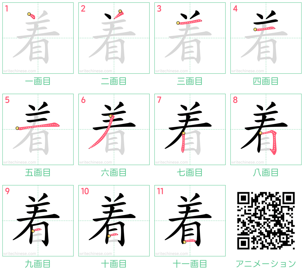 視覚的なステップバイステップの指示を使って、中国語の漢字「着」の書き順を一画ずつマスターしましょう。
