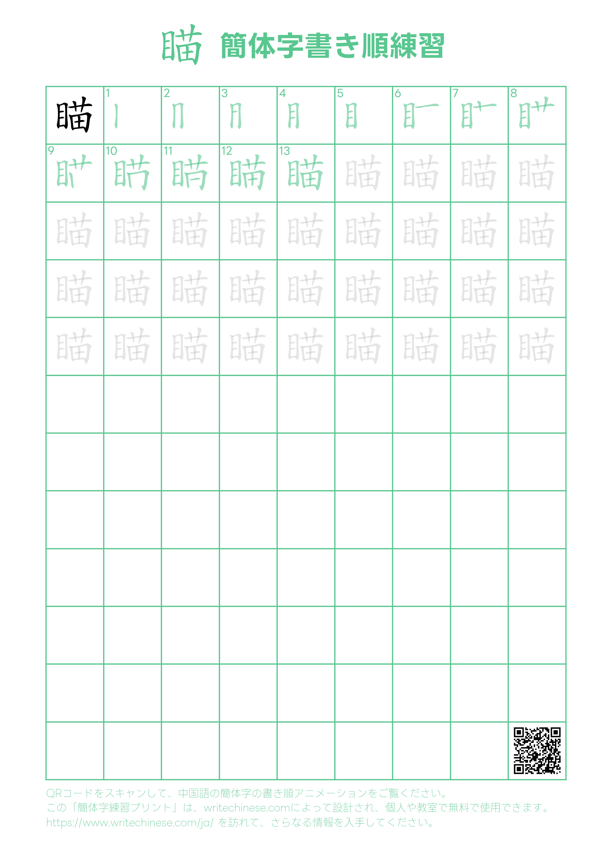 視覚的なステップバイステップの指示を使って、中国語の漢字「瞄」の書き順を一画ずつマスターしましょう。