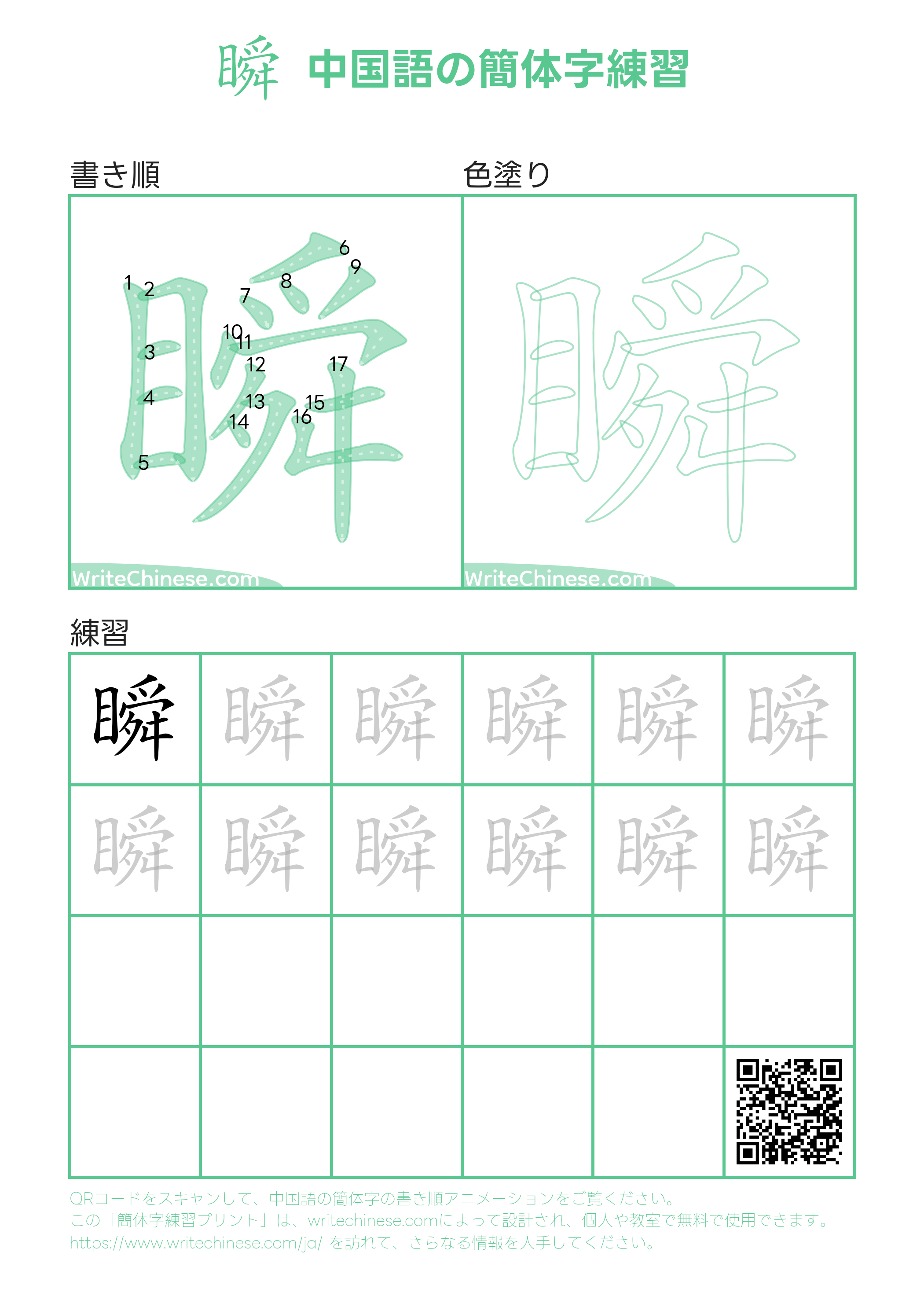 書道の先生によるビデオチュートリアルで、中国語「瞬」の正しい書き方を学びましょう。書道の達人によるステップバイステップのガイドに従って、中国語「瞬」を書きましょう。以下の印刷可能な手書き用のワークシートをダウンロードして、ペンと紙で一緒に書く練習をしましょう。