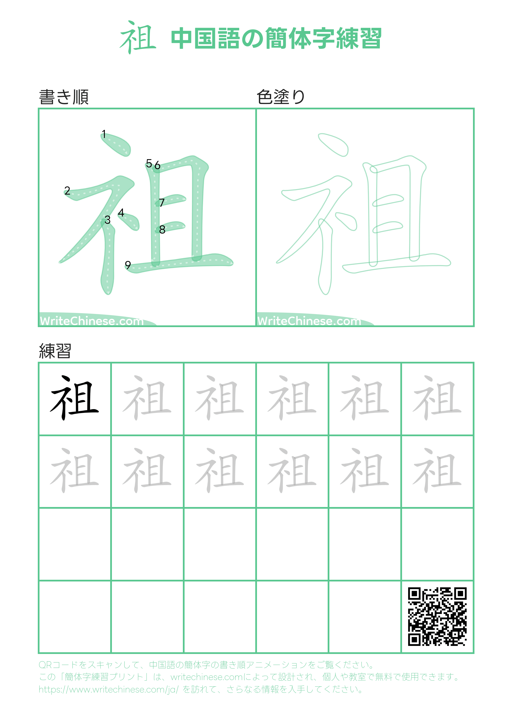 中国語の簡体字「祖」の印刷可能な書き練習用ワークシート