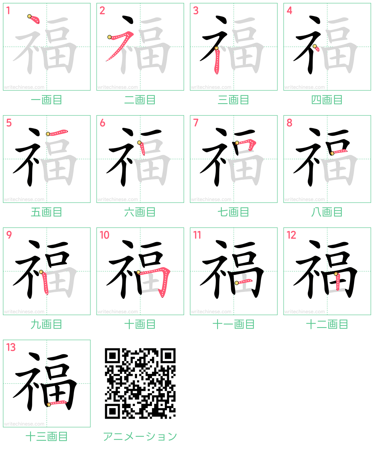 視覚的なステップバイステップの指示を使って、中国語の漢字「福」の書き順を一画ずつマスターしましょう。