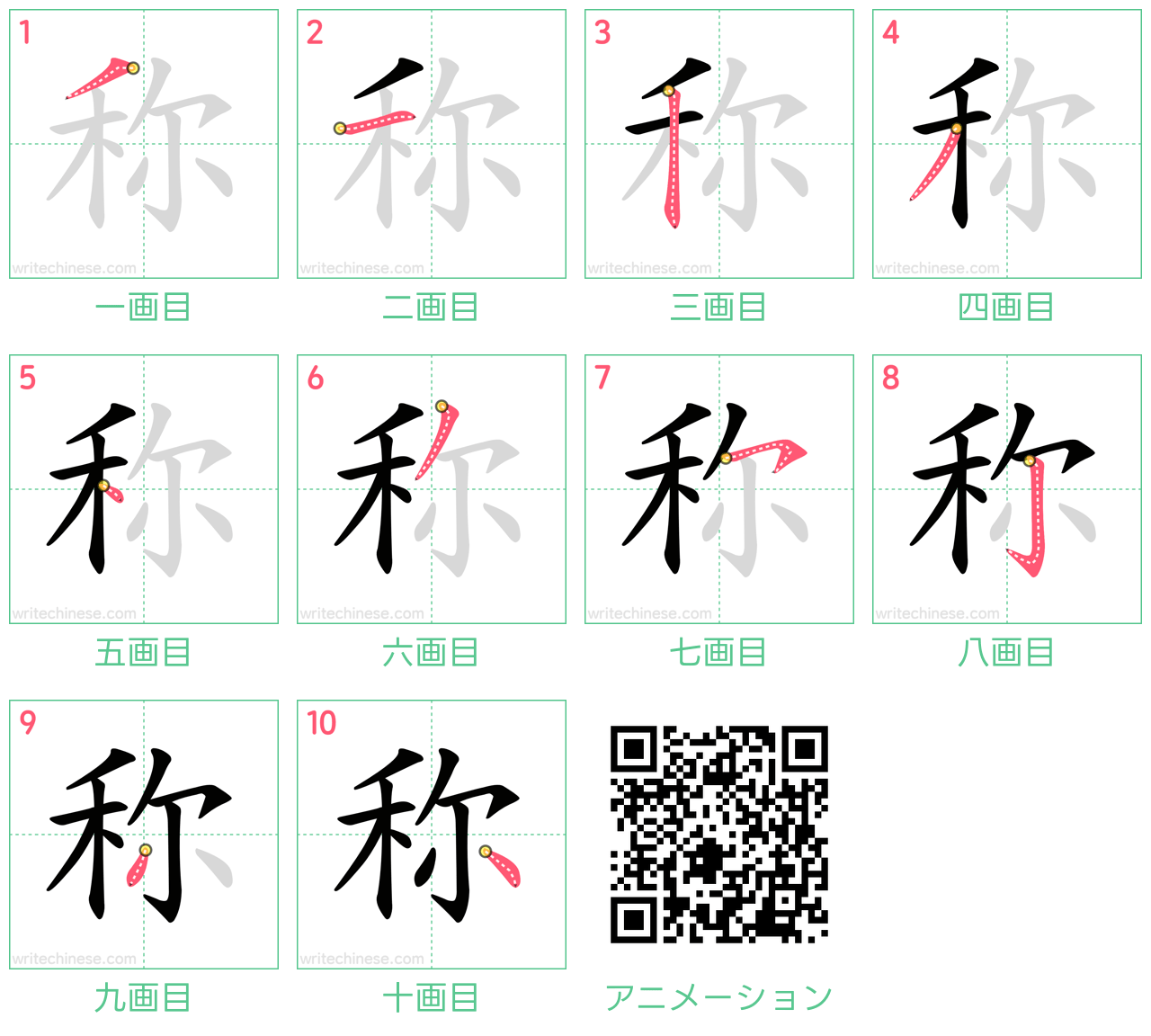 視覚的なステップバイステップの指示を使って、中国語の漢字「称 」の書き順を一画ずつマスターしましょう。