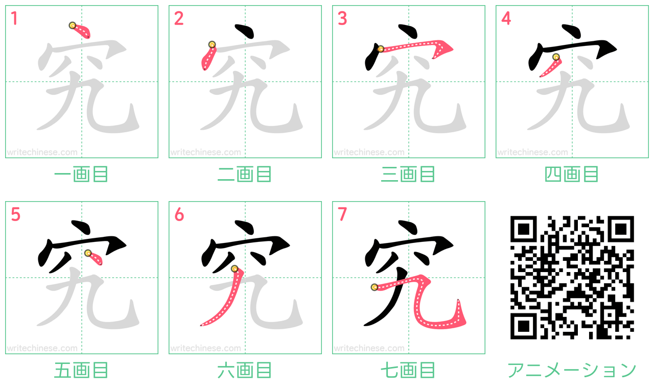 視覚的なステップバイステップの指示を使って、中国語の漢字「究」の書き順を一画ずつマスターしましょう。