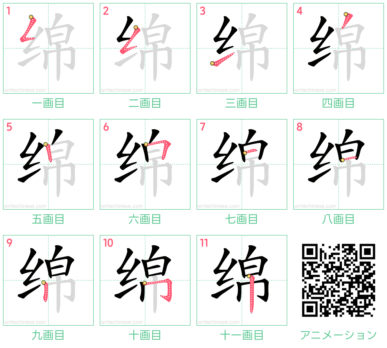 視覚的なステップバイステップの指示を使って、中国語の漢字「绵」の書き順を一画ずつマスターしましょう。