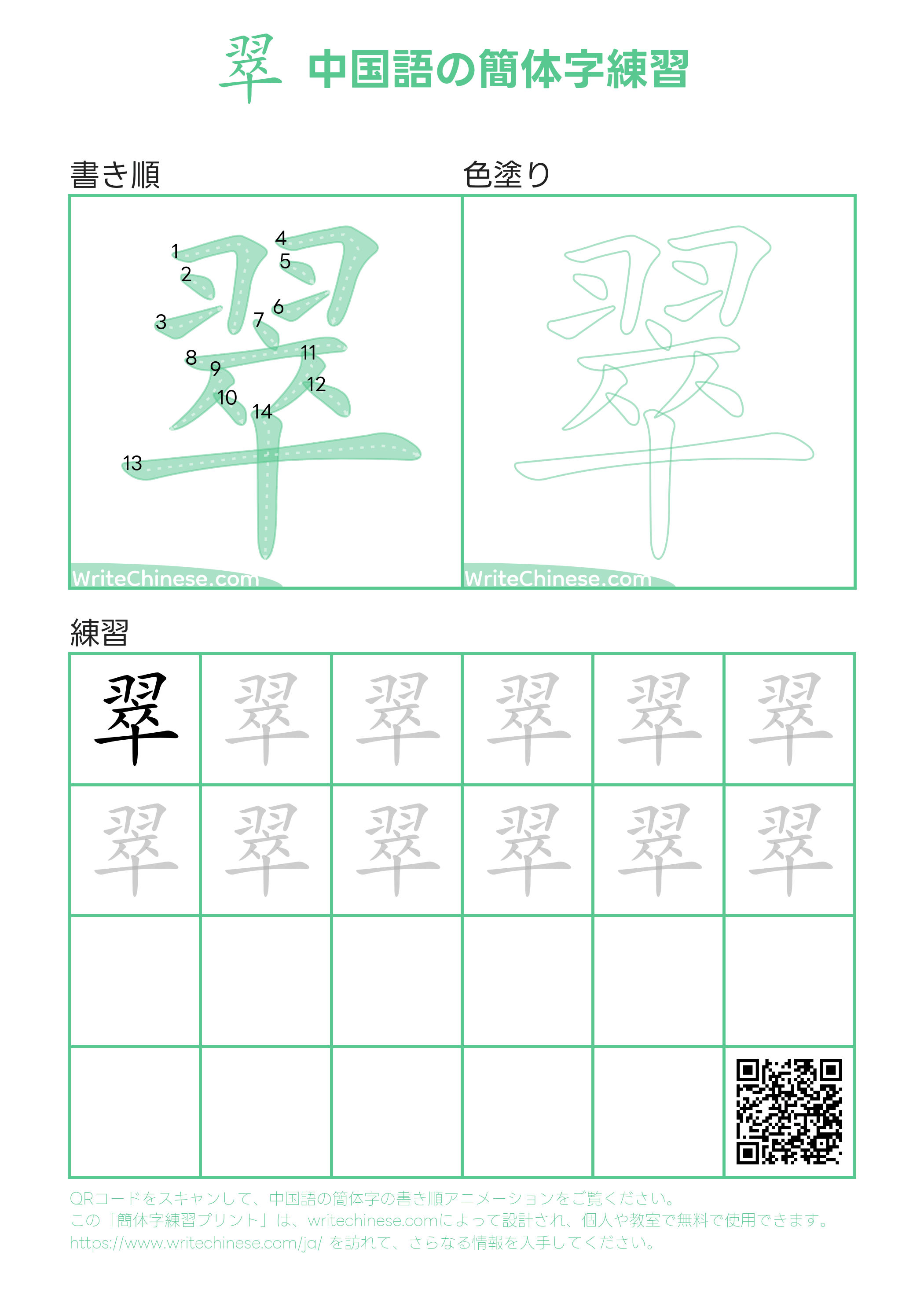 中国語の簡体字「翠」の印刷可能な書き練習用ワークシート