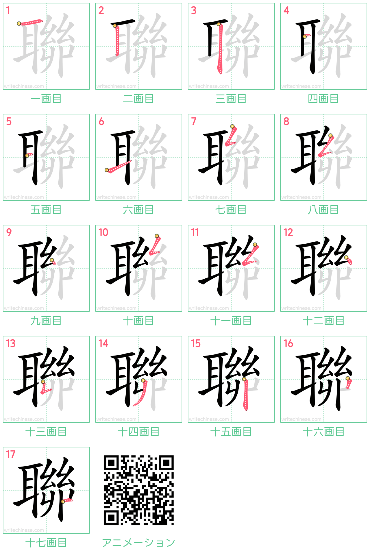 視覚的なステップバイステップの指示を使って、中国語の漢字「聯」の書き順を一画ずつマスターしましょう。
