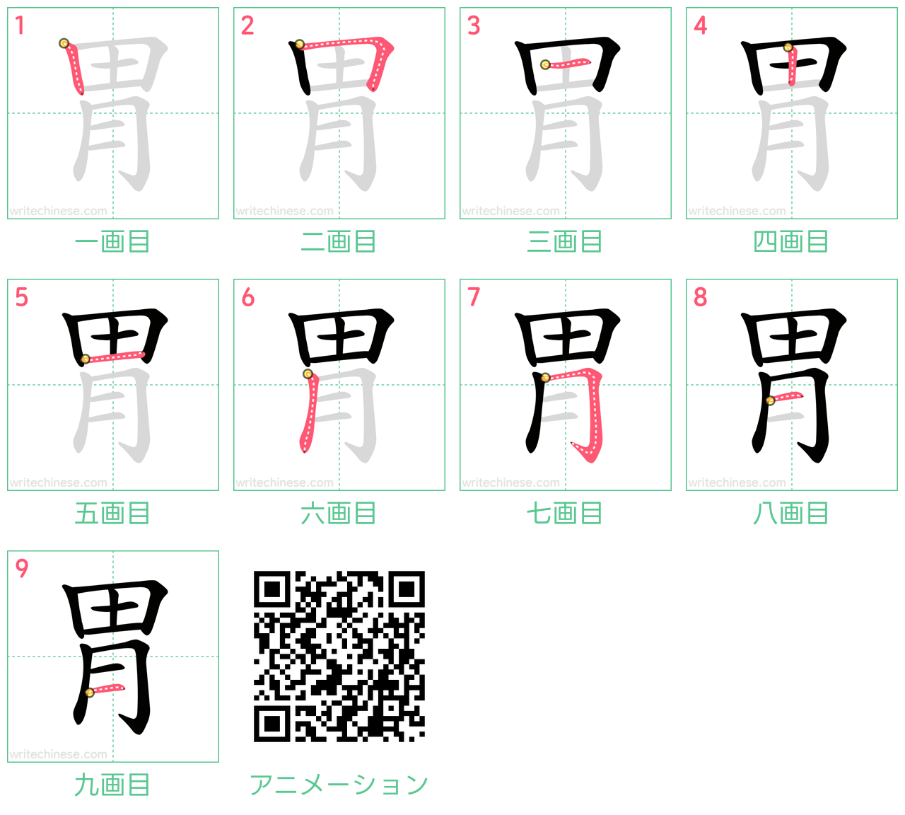 視覚的なステップバイステップの指示を使って、中国語の漢字「胃」の書き順を一画ずつマスターしましょう。