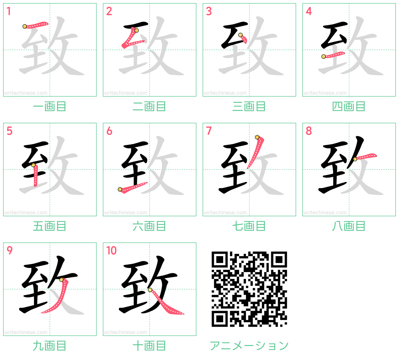 視覚的なステップバイステップの指示を使って、中国語の漢字「致」の書き順を一画ずつマスターしましょう。