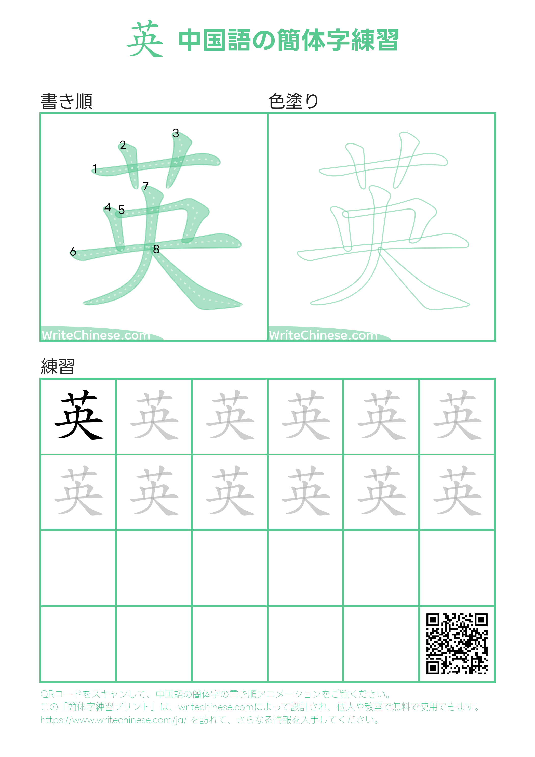 書道の先生によるビデオチュートリアルで、中国語「英」の正しい書き方を学びましょう。書道の達人によるステップバイステップのガイドに従って、中国語「英」を書きましょう。以下の印刷可能な手書き用のワークシートをダウンロードして、ペンと紙で一緒に書く練習をしましょう。
