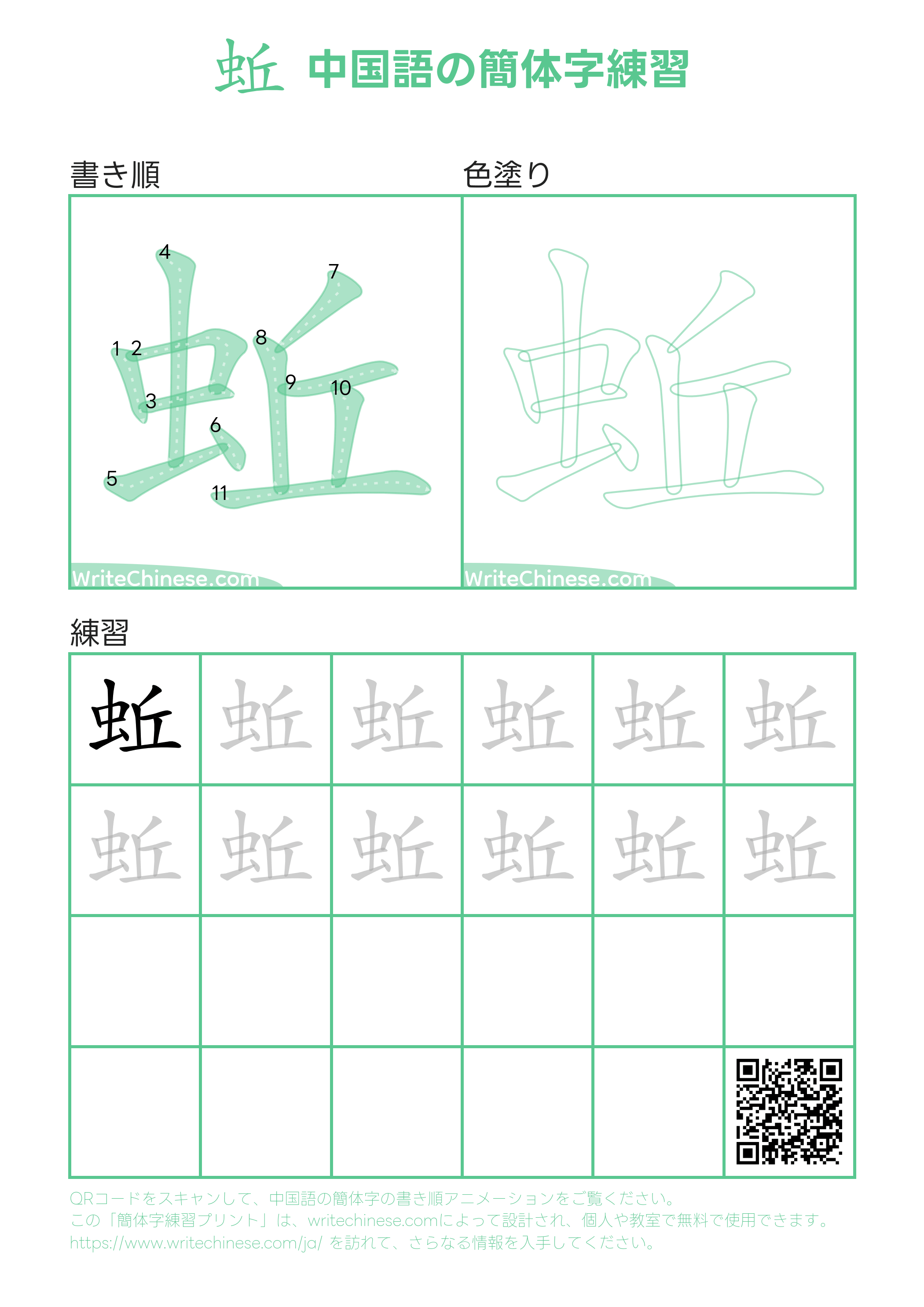 書道の先生によるビデオチュートリアルで、中国語「蚯」の正しい書き方を学びましょう。書道の達人によるステップバイステップのガイドに従って、中国語「蚯」を書きましょう。以下の印刷可能な手書き用のワークシートをダウンロードして、ペンと紙で一緒に書く練習をしましょう。