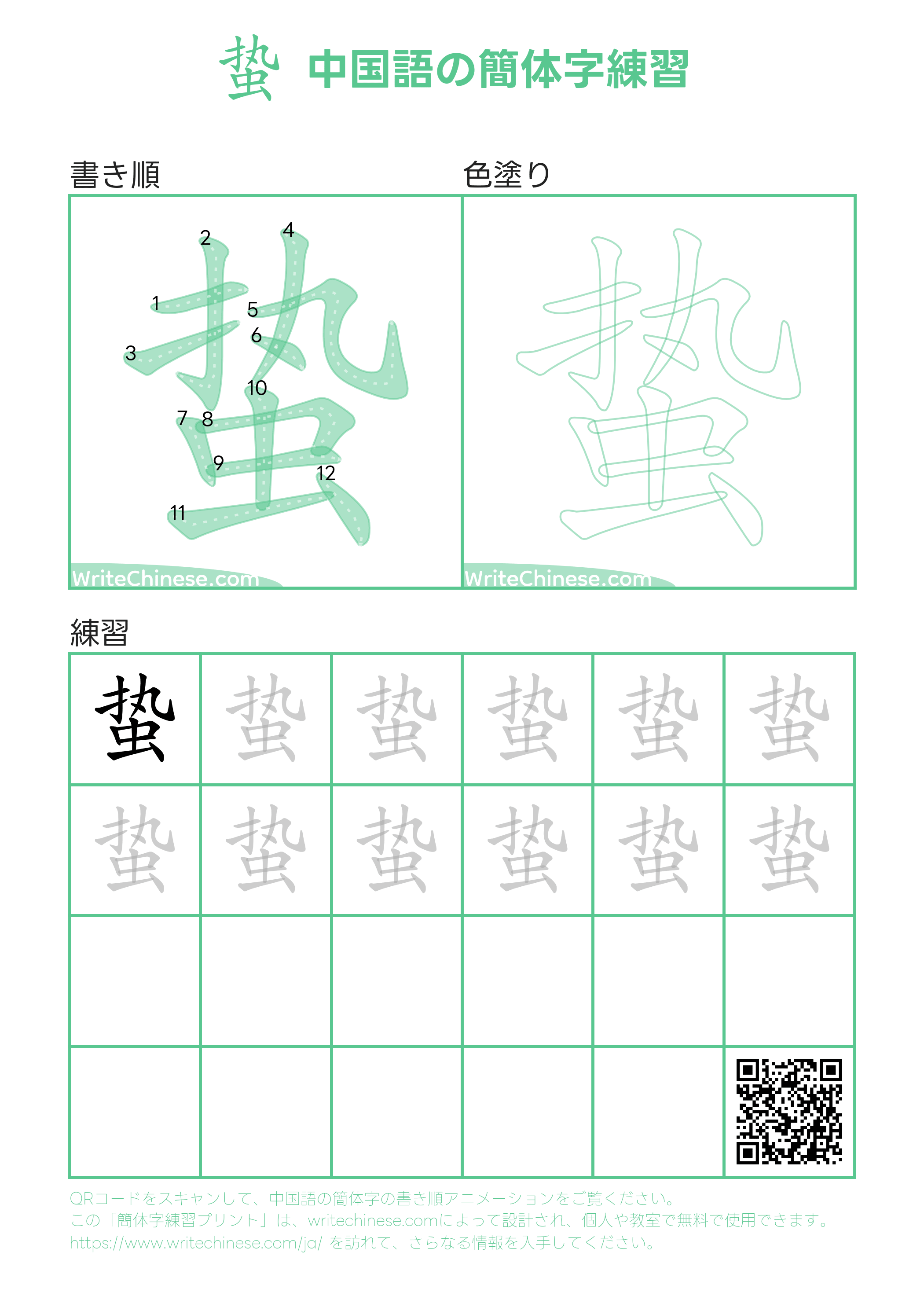 書道の先生によるビデオチュートリアルで、中国語「蛰」の正しい書き方を学びましょう。書道の達人によるステップバイステップのガイドに従って、中国語「蛰」を書きましょう。以下の印刷可能な手書き用のワークシートをダウンロードして、ペンと紙で一緒に書く練習をしましょう。