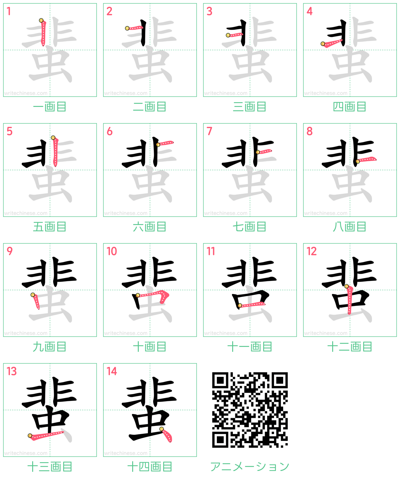 視覚的なステップバイステップの指示を使って、中国語の漢字「蜚」の書き順を一画ずつマスターしましょう。