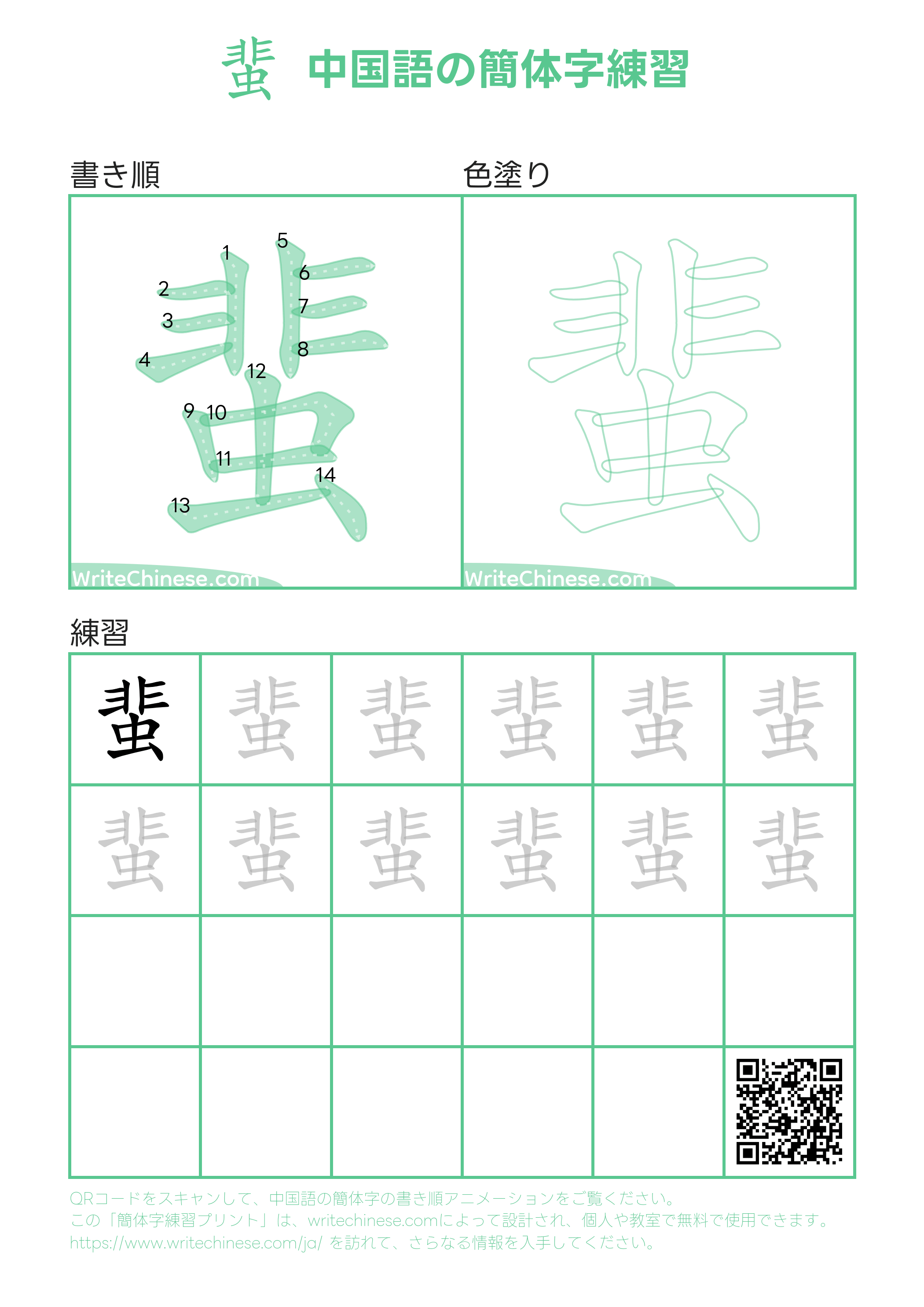 書道の先生によるビデオチュートリアルで、中国語「蜚」の正しい書き方を学びましょう。書道の達人によるステップバイステップのガイドに従って、中国語「蜚」を書きましょう。以下の印刷可能な手書き用のワークシートをダウンロードして、ペンと紙で一緒に書く練習をしましょう。