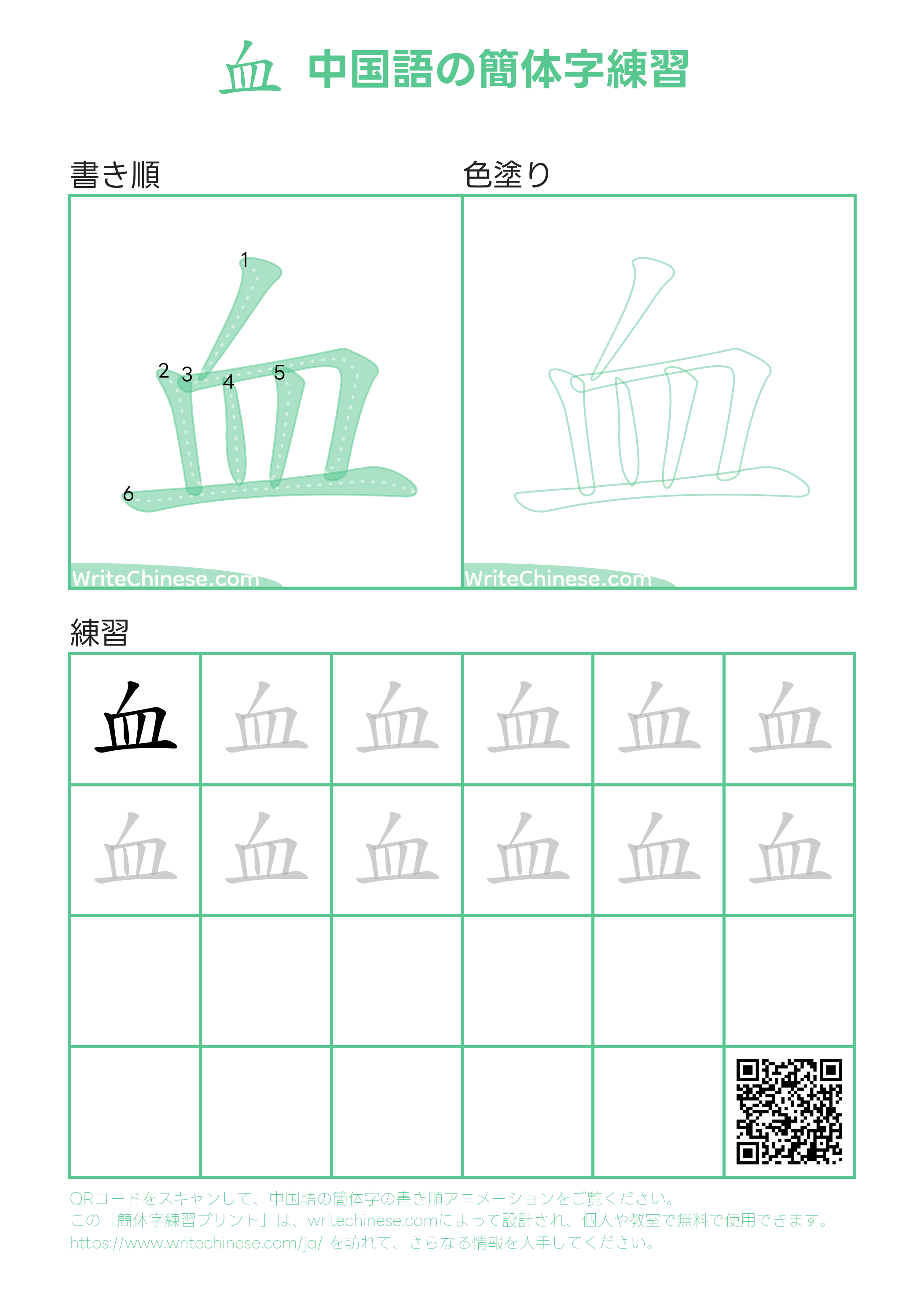 中国語の簡体字「血」の書き順練習用の印刷可能なワークシート