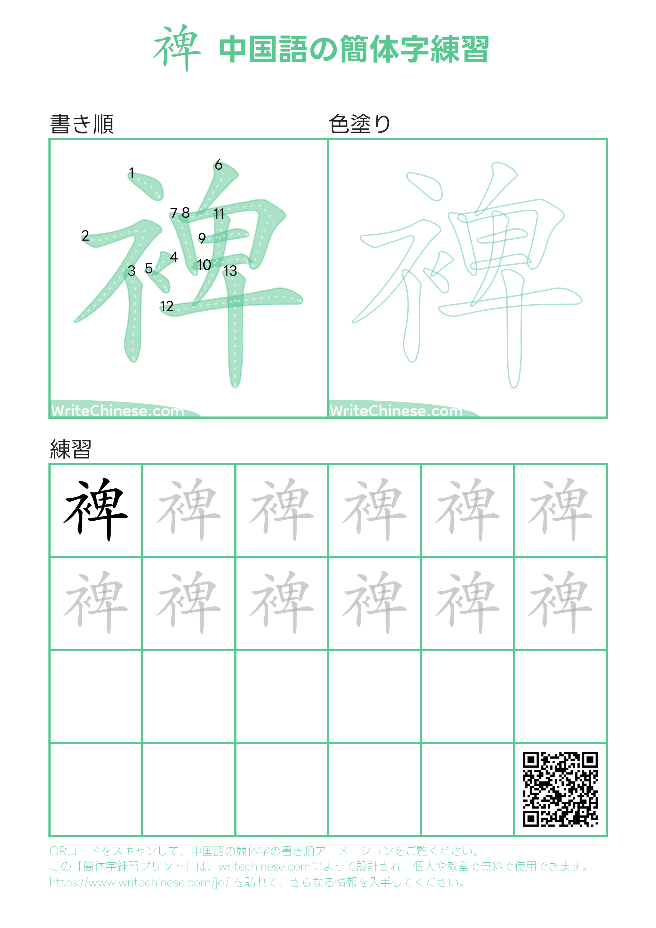 無料の印刷可能な「裨」の手書き練習用ワークシート