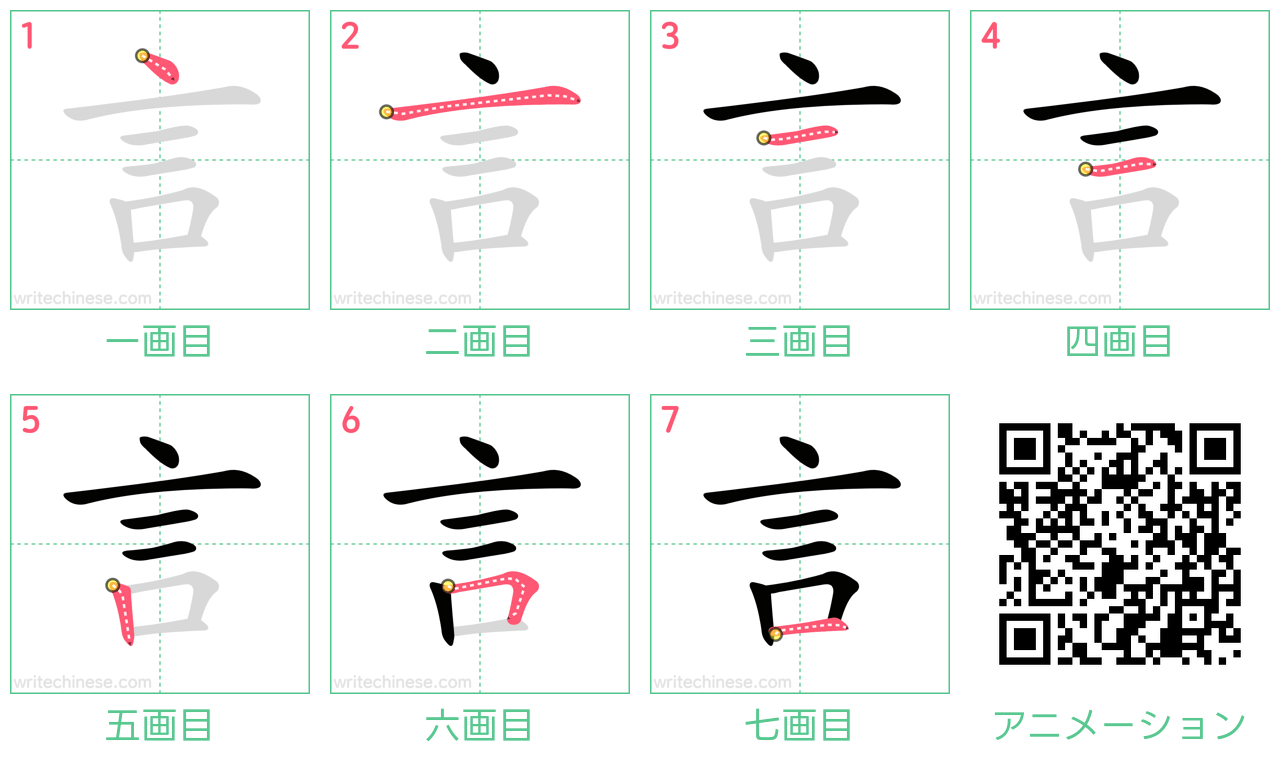 視覚的なステップバイステップの指示を使って、中国語の漢字「言」の書き順を一画ずつマスターしましょう。