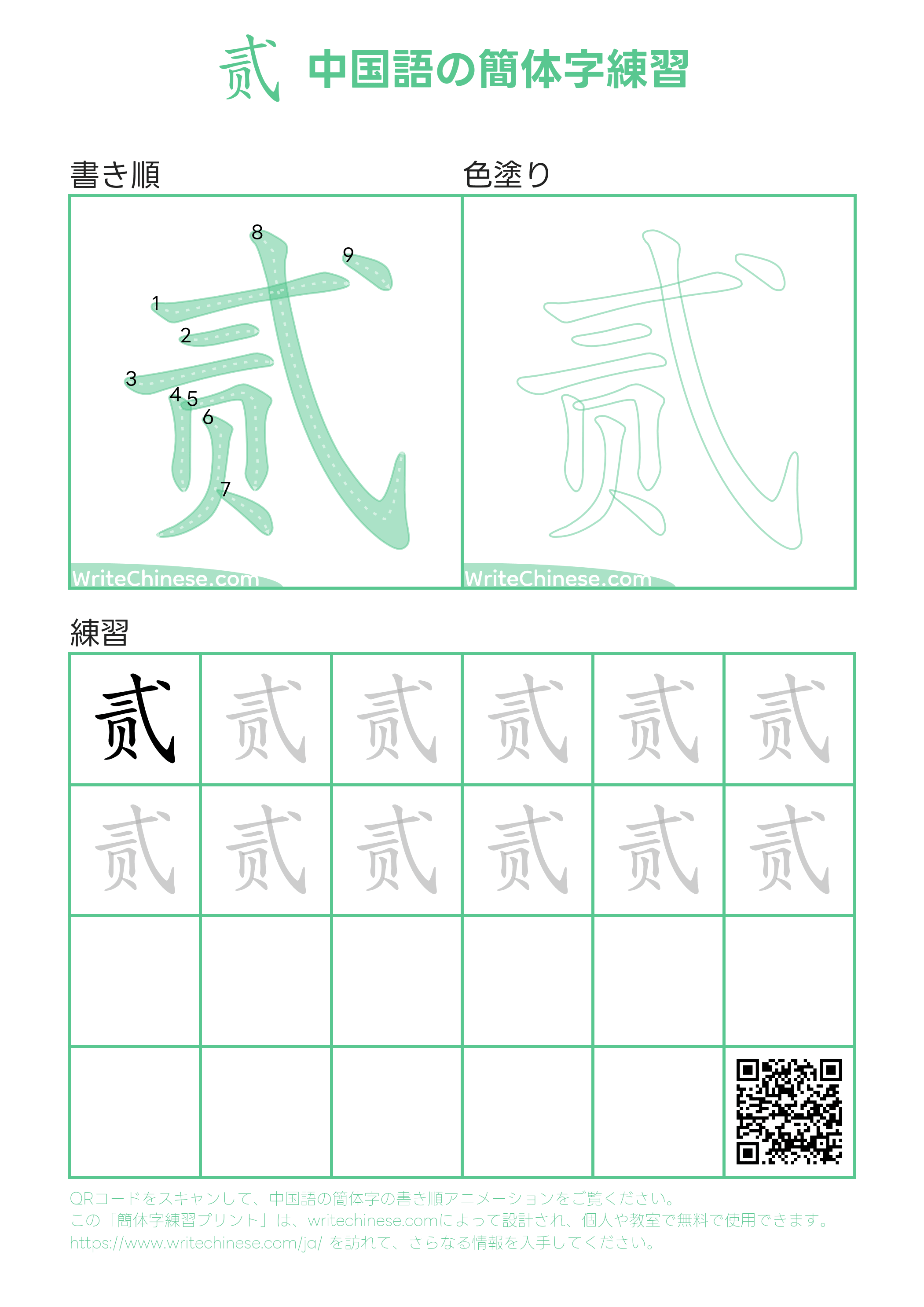 書道の先生によるビデオチュートリアルで、中国語「贰」の正しい書き方を学びましょう。書道の達人によるステップバイステップのガイドに従って、中国語「贰」を書きましょう。以下の印刷可能な手書き用のワークシートをダウンロードして、ペンと紙で一緒に書く練習をしましょう。