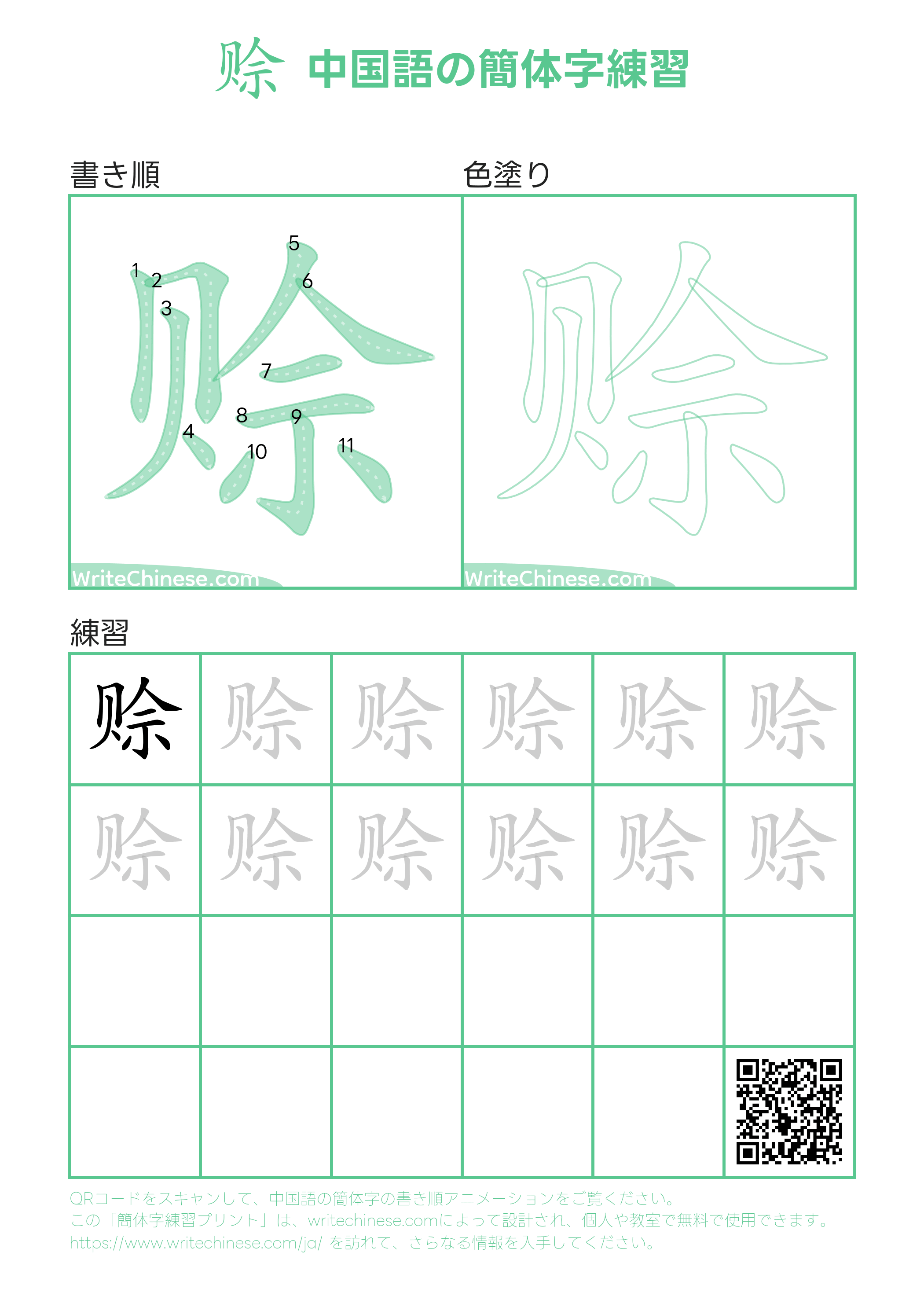 無料の印刷可能な「赊」の手書き練習用ワークシート