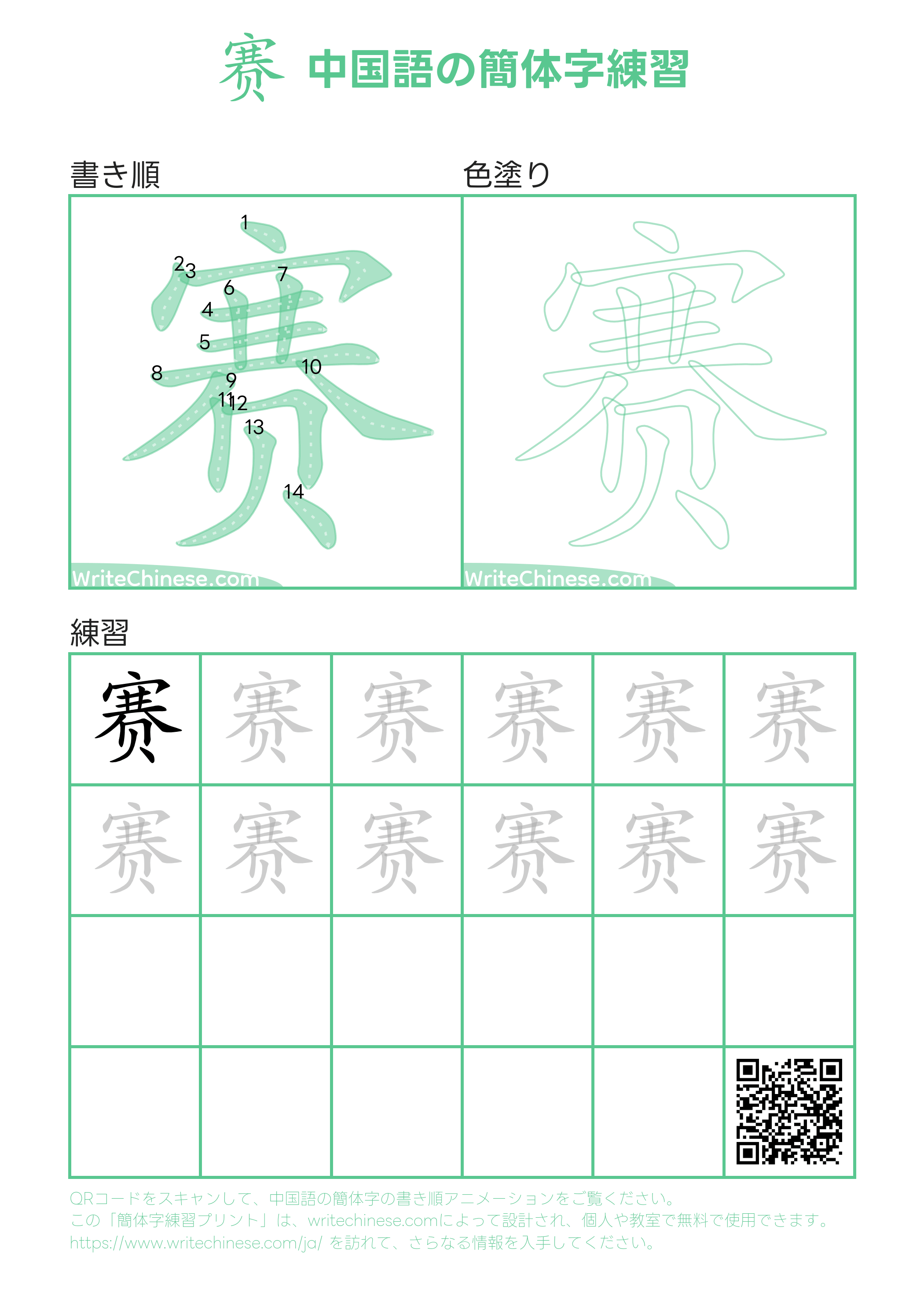 中国語の簡体字「赛」の筆順アニメーションを見て、「赛」という漢字の書き方を学びましょう。