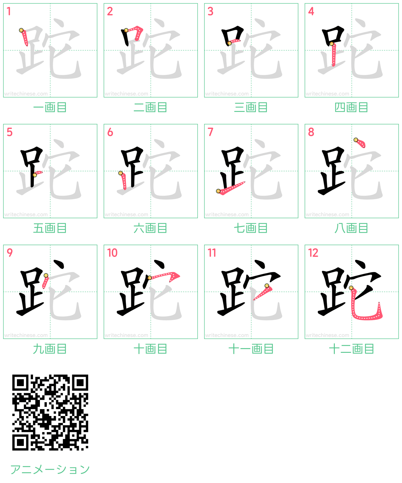 視覚的なステップバイステップの指示を使って、中国語の漢字「跎」の書き順を一画ずつマスターしましょう。
