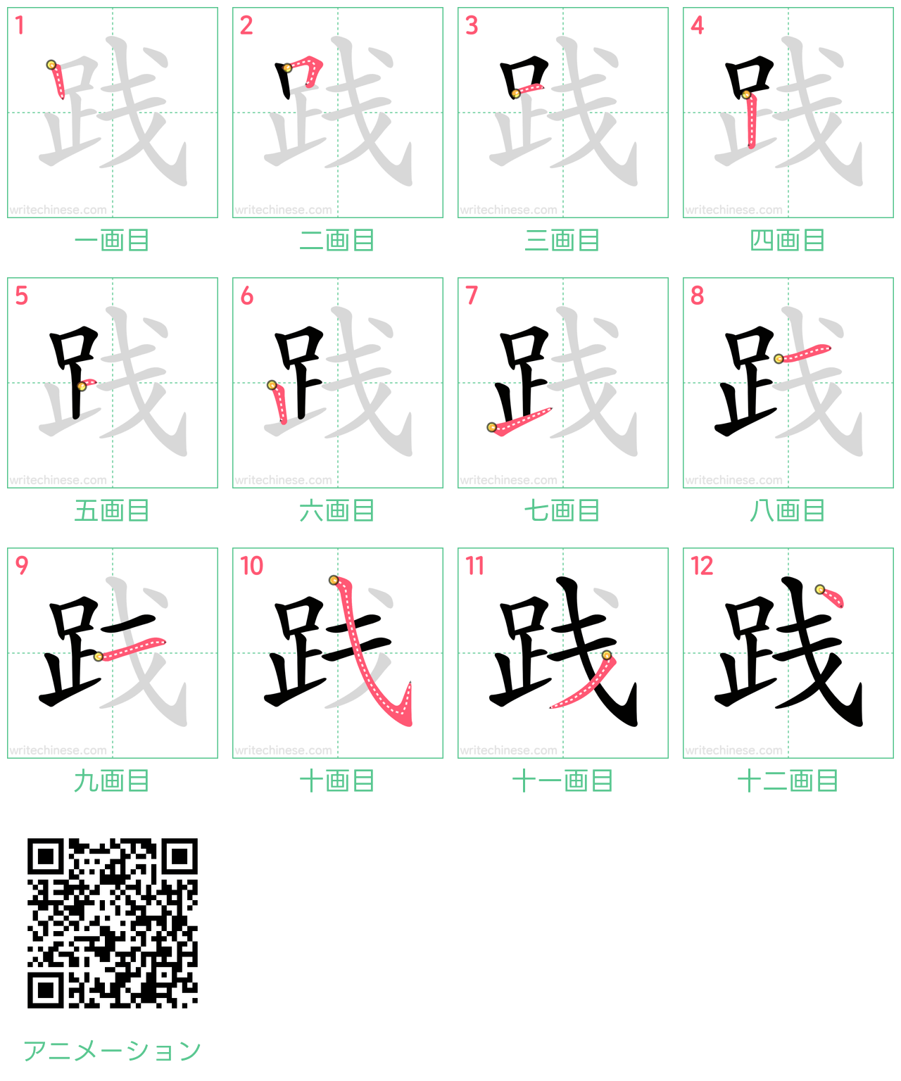 中国語の簡体字「践」の筆順アニメーションを見て、「践」という漢字の書き方を学びましょう。
