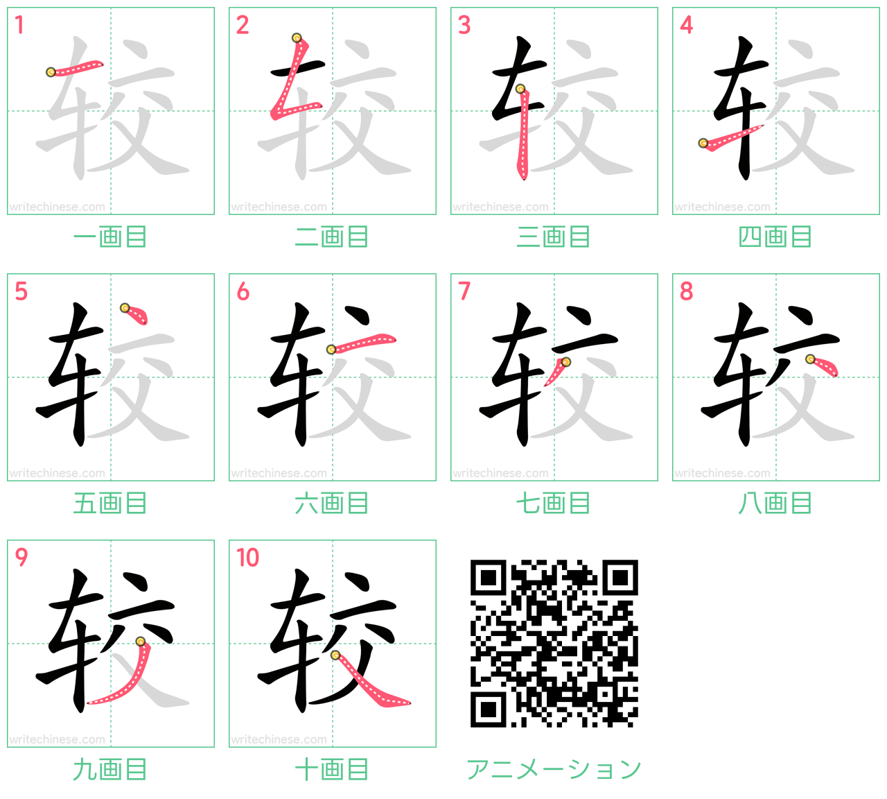視覚的なステップバイステップの指示を使って、中国語の漢字「较」の書き順を一画ずつマスターしましょう。